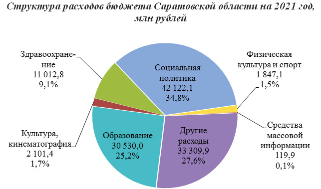 Социальные расходы бюджета Саратовской области на 2021 год запланированы в объеме 87,7 млрд рублей. Их доля составляет более 72% от общего объема расходов областного бюджета, в том числе в сферах: образования (25,2%), социальной политики (34,8%), здравоохранения (9,1%), физической культуры и спорта (1,5%), культуры (1,7%).