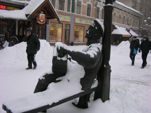 Надо сказать, что в квартале от «мужика с гармошкой» на деньги компании «Мегафон» еще раньше поставили памятник другому неизвестному мужику с часами, так что это был уже не первый «сеятель» на проспекте Кирова и, думаю, к сожалению, не последний.