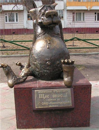 В камне, бронзе, железе и т.д. увековечены буква «Ё», плавленый сырок «Дружба», водопроводный кран, табуретка, «огурец-кормилец», пельмень, электрический фонарь, на который писает дворняга, Чижик-пыжик, Киса Воробьянинов, Остап Бендер и даже «счастье», как его видит МДПешник из Томска при изменении фаз с мании на депрессию. Наверное, нездоровый автор наглядно изобразил свое состояние, когда эйфория скачкообразно переходит в дисфорию. Даже великий мастер копирования болезненных психических состояний профессор В.В.Козлов не смог бы быть более точным