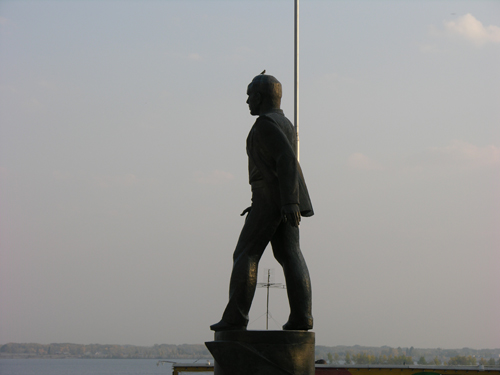 Бронзовый «мужик» дегенеративного вида с непропорционально длинной шеей, как две капли воды похож на слабоумного гармониста, лет тридцать назад жившего в поселке Увек, что на окраине Саратова. Ветераны Заводского РОВД рассказывали, как часто извлекали увекского дурочка-гармониста из грязных притонов, где он на радость всякой сволочи зажигательно играл «Камаринского…» во время сексуальных оргий. А однажды железнодорожница в форменной одежде открыла для него радости межполового интимного общения и с тех пор женщины в этом поселке ходить в форме боялись, даже милиционершам рекомендовали переодеваться в «гражданку» во избежание дурацкого изнасилования.