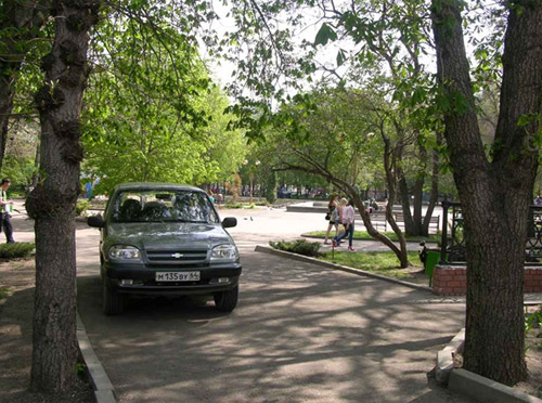 Парк «Липки» Саратова. Еще недавно здесь стоял памятник Герою Советского Союза командиру авиационного полка М.М.Расковой. Теперь это, как видите, удобная автостоянка.