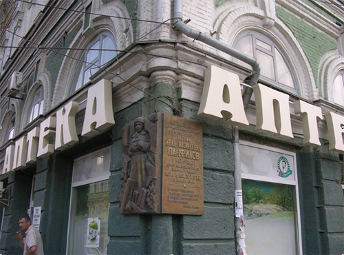Мемориальная доска на доме, где работал И.В.Панфилов – генерал, остановивший немцев под Москвой в 1941 году. Не надо быть большим эстетом или специалистом по охране памятников, чтобы понять, что вывеска не должна быть рядом с мемориальной доской, а уж тем более, над ней. Простите за черный юмор, но ощущение, что герой работал в аптеке «Доктор Столетов». И никому не стыдно.