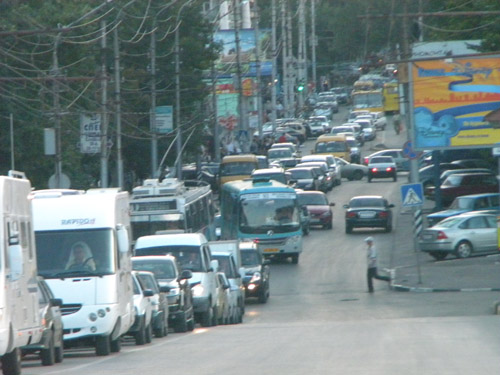 Вечером в среду, когда борт президентского лайнера должен был коснуться саратовской земли, корреспонденты нашей интернет-газеты провели своего рода эксперимент. В пять часов вечера мы выехали из Саратова через Энгельс в Шумейку. До города-спутника к нашему удивлению добрались относительно легко. А вот когда уже подобрались к его центру, столкнулись с проблемой – все машины заворачивали в обход. А вскоре растянувшийся на несколько километров пелетон встал. Стояли все, в том числе и общественный транспорт, серьезно подкорректировавший свой маршрут. Все дороги, ведущие к трассе на Маркс были заблокированы. Примерно в это время на энгельсском военном аэродроме уже встречали первое лицо страны. У торопившихся домой водителей стали сдавать нервы, часть из них попыталась объехать вереницу по встречной полосе, одна из таких попыток закончилась ДТП. Столкнувшиеся перекрыли одну из двух полос, тем самым усугубив и без того непростое положение. Устав от почти часовых мучений мы вышли из машины и отправились по остановившейся Нестерова к перекрытой Полиграфической. На перекрестке два сотрудника ДПС ловко орудовали жезлами, расчищая улицу для кортежа.