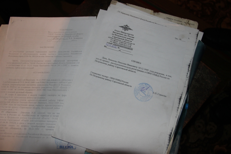 Но это еще не все – у Линькова есть серия и номер сгоревшего паспорта, которые подтверждены адресно-справочной службой УФМС России по Саратовской области, однако в ходе проведенной в 2014 году этим ведомством проверки его документ признан незаконно выданным взамен советского паспорта. В заключении также говорится, что на 6 февраля 1992 года сведений о его проживании в России не имеется. В это время Николай, по его словам, находился в Баку, а в Петровский район приехал только в октябре. То есть если бы до 6 февраля он жил бы в 1-й Сосновке, то сложностей в восстановлении гражданства было бы все же меньше.