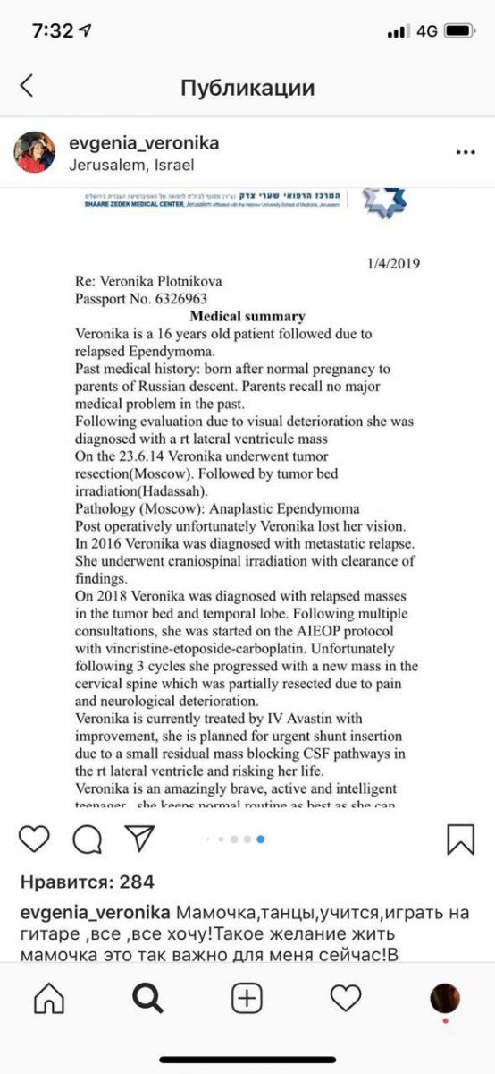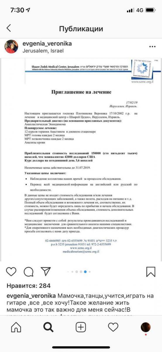 «Назначение в 12 приемов, каждые 2 недели, две из них мы сделали. Препарат очень дорогой. Стоимость одной ампулы 5600 шекелей, это 100 тысяч рублей, плюс подготовка лекарства, так как покупка и его введение 2100 шекелей за одно посещение. Патронаж медсестры на дом 2 000 шекелей месяц. Все вместе около 2 000 000 миллионов рублей. Такой суммы нам не осилить. У нас не осталось денег, чтоб продолжать лечение, мы просим вас помочь», - обращается к подписчикам Евгения.