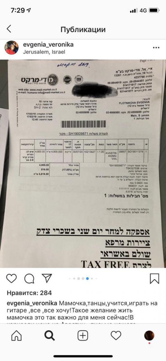 Обман вскрылся практически моментально. Оказалось, что стоимость 1 инъекции препарата «Авастин» стоит 5000 рублей, а не шекелей. При этом 4800 шекелей стоит весь курс препарата, но Евгения просит по 100 тысяч рублей на одну инъекцию. Указанная стоимость одного укола в 2100 шекелей вызывает не просто сомнения, а кажется наглой ложью. Доказать свою правоту можно, предоставив из больницы документ-счет, регламентирующий стоимость одного укола. Посещение медсестер – процедура официальная, и деньги от их посещений на дому в любом случае платятся в клинику. Так пусть предоставит счет своим подписчикам!
