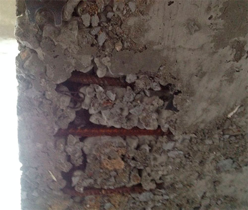 На фотографии №1 видно, что несущая колонна в здании выглядит так, будто ее расстреляли из пулемета: на ней трещины и ямки, которые именуются сколами и раковинами. Все эти огрехи гораздо больше по размеру и глубже, чем полагается по нормам, а именно по Своду правил 70.13330.2012 и СНиП 3.03.02-87 (или просто СП). Трещин же на колоннах не должно быть вовсе, разве что совсем мелкие, поверхностные. Здесь же видно, что трещины большие, более 2 мм шириной. Точно такие же следы разрушения виднеются в доме везде - на стенах и на потолках. Они свидетельствуют о том, что при строительстве применялся некачественный бетон, о том, что сами работы велись из рук вон плохо, слабо контролировались, а также о том, что у авторов 10-этажного «чуда» нет совести и чувства страха. Несущие колонны - это конструкции, благодаря которым и стоит здание, их плохое состояние однажды может привести к тому, что здание рухнет.