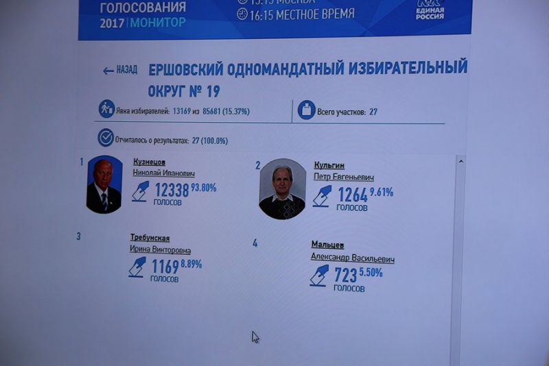 Наибольшее количество голосов собрал в Ершовском одномандатном округе № 19 ректор СГАУ Николай Кузнецов, он получил 93,8%. На 2-м месте Роман Ковальский – 89,3% (Калининский одномандатный округ №13), на 3-м месте Леонид Чернощеков (Краснокутский одномандатный округ №18) 86,5%.