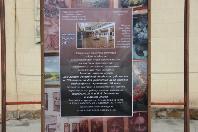«Так получилось, что помимо нашей «маленькой круглой даты» сегодня исполняется 260 лет Российской Академии художеств и 100 лет со дня рождения выдающегося скульптора 20 века Льва Кербеля. Ну а кроме этого, в этом году есть и еще одна немаловажная дата - 325 лет со дня основания районного поселка Базарный Карабулак», - сообщил в начале церемонии открытия директор музея Вячеслав Лапшин.