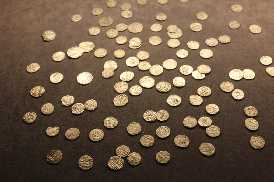 Один из представленных на выставке кладов – это 105 серебряных монет. Их обнаружили летом 2022 года при раскопках средневекового города Укек в ходе археологической экспедиции Дмитрия Кубанкина. Эти монеты – один из самых уникальных экспонатов выставки. Причина заключается в том, что на сегодняшний день это единственный клад, обнаруженный при раскопках городища за всю историю его изучения.