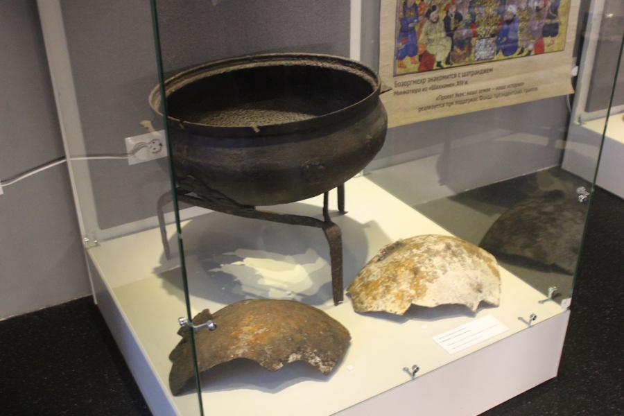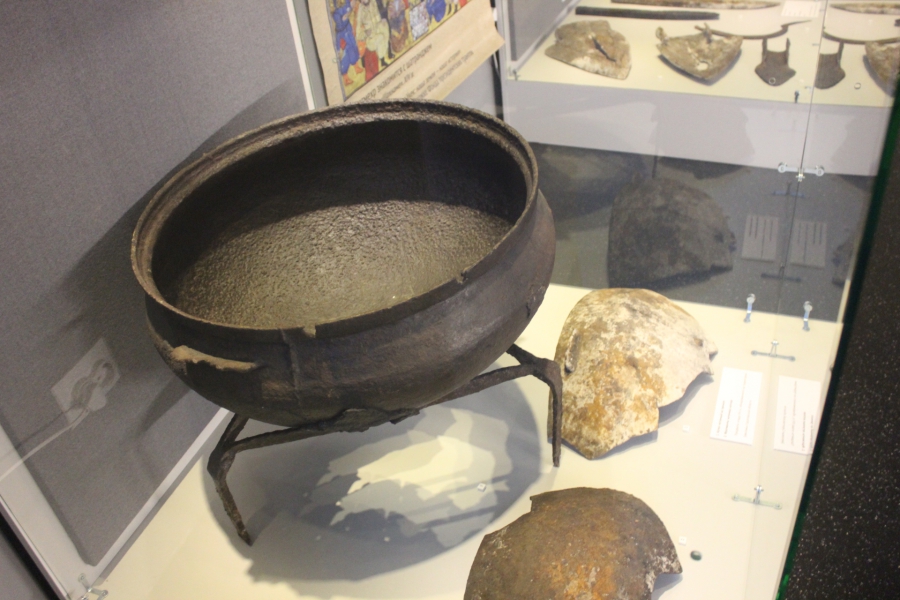 В этом кладе нашли чугунный котел вместимостью 25 литров на треноге. Чугун жители Золотой Орды научились «варить» в XIV веке, но из-за того, что металл был колким, подобная посуда редко сохранялась в целом виде до наших дней. Однако для археологов это ценный материал, поскольку целый котел дает представление, что изделие отливали в земляной форме. Помимо этого, его латали железными клепками и при варке пищи ставили на специальную очажную треногу.