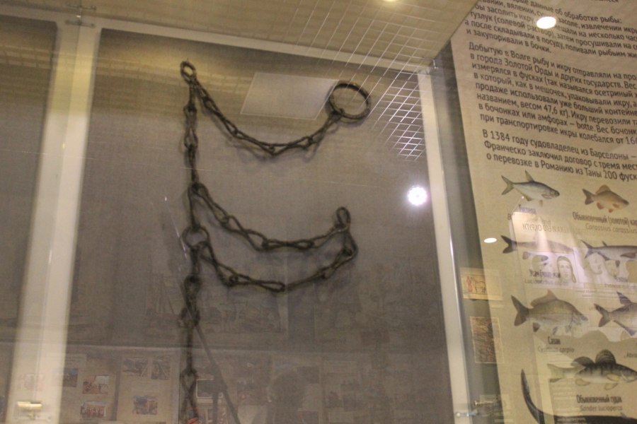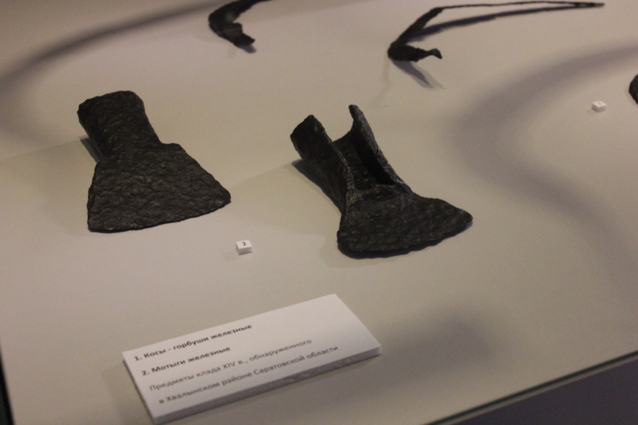 Еще один клад, представленный на выставке в Историческом парке, привезли прямиком из Хвалынска. Во время полевых работ в 2021 году на южной окраине были обнаружены несколько десятков закопанных бытовых предметов и сельскохозяйственных орудий. Все они принадлежали золотоордынской эпохе. Там обнаружили медные котлы на железных очажных цепях, топоры, серпы, косы, мотыги, долота, серебряные монеты. Еще там нашли фрагменты ювелирных украшений, например, желудевидную серебряную подвеску. А еще частички бронзовых зеркал.