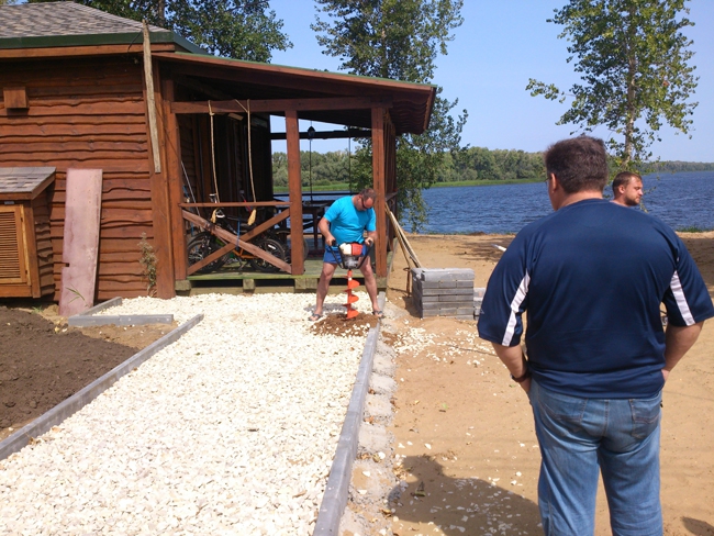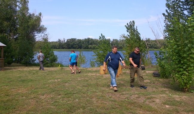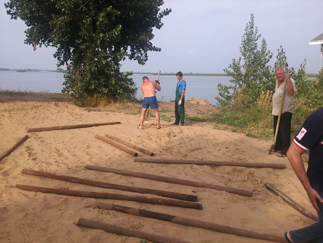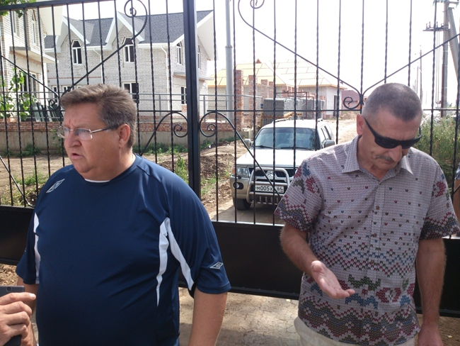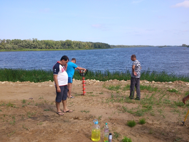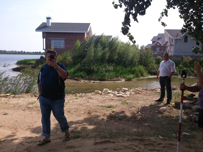 Что же делал в тот выходной день 17 августа на турбазе работник Энгельсской районной администрации Александр Овечкин (усатый мужчина в темных очках на первой фотографии, рядом с ним - сам Игорь Морозов)? Какое он имеет отношение к спору собственников? Чиновник показал свое удостоверение, но при этом заявил, что приехал как «друг» депутата, чтобы «разъяснить сторонам, что все происходит на законных основаниях». Очень полезные «друзья» оказались у г-на Морозова. Примерно через 2 часа на турбазу приехала полиция во главе с начальником 5-го отдела полиции. Страж порядка, по всей видимости, близким «другом» депутата не был, он не стал вмешиваться в споры, а лишь следил за тем, чтобы те не переросли в силовое противостояние. Из-за автомобилей работников «Тополька» тяжелая громоздкая техника г-на Морозова не могла проехать по мосту, соединяющем турбазу с «материком». Тогда люди повыпрыгивали из грузовиков, взяли в руки трубы и пешком пошли к Волге - поскольку береговая линия является местом общего пользования, то они имели полное право туда пройти. Итак, рабочие подошли к берегу, попытались вкопать трубы, однако у них ничего не получилось. На этом первый день противостояния закончился - депутат со свитой удалился. На следующий день он вернулся с геодезистами и рабочими с механическим буром, они пробурили вдоль всего берега реки ямы, поставили в них столбы, залили их цементом и натянули между ними веревку - в общем, парламентарий огородил «свой личный» берег Волги. Он сам руководил работами, причем, свободно распоряжался и на соседнем участке собственника Гикаева, словно бы эта земля тоже принадлежала ему. Именно тогда Морозов показал документы, на основании которых ему дали в аренду землю: некую карту, согласно которой между турбазой и 20-метровой береговой линией, существует свободное пространство. Кстати, так получилось, что установленное рабочими ограждение разрезало на две части 2 домика турбазы - то есть, Морозов умудрился взять в аренду землю, уже занятую постройками турбазы.