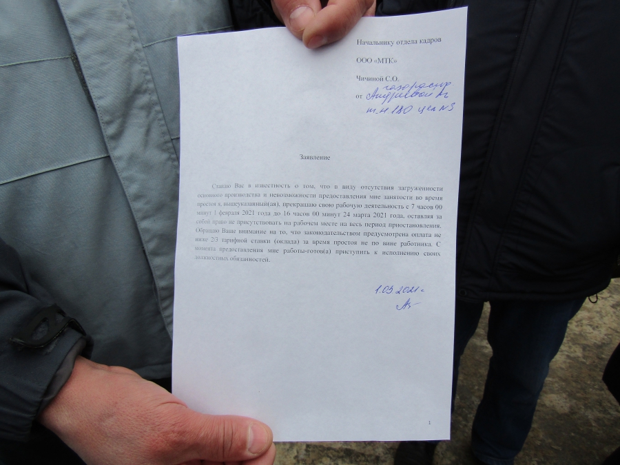 Как заявили собравшиеся, функции администрации на предприятии, по сути, выполняет юрлицо ООО «МТК». Соответственно, это же юрлицо обеспечивает выплаты рабочим. Однако с февраля работников завода заставили написать заявления на отпуск за свой счет. Сделать подобное требуют от людей и в марте.