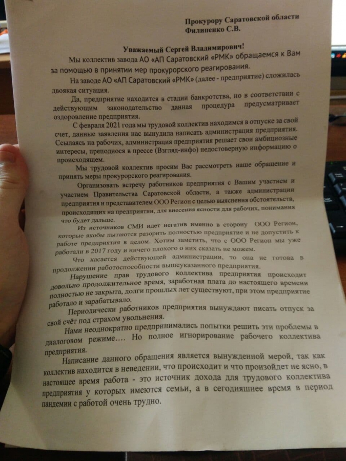 Заводчане просят вмешаться в ситуацию прокуратуру Саратовской области. Они хотят встречу с представителями правительства, надзорного органа, конкурсного управляющего (если такой появится) и ГК «Регион» (самарский инвестор) для внесения ясности и лучшего понимания своего будущего. Свое обращение коллектив завода передал в областную прокуратуру. В нем они отмечают, что против «Региона» идет волна негатива в СМИ. В то же время сами рабочие не видят в инвесторах никакой опасности.
