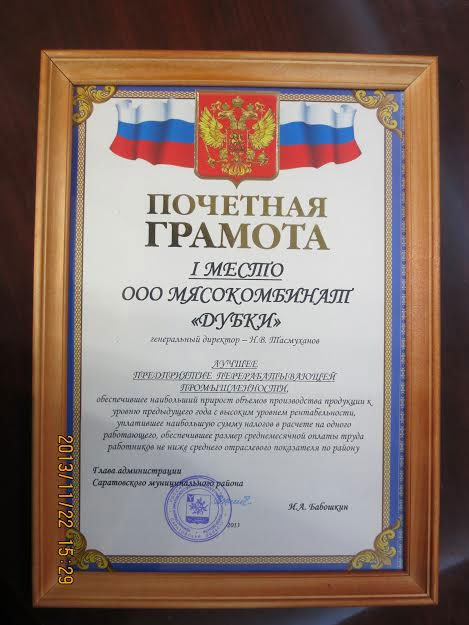 По итогам года, лучшим предприятием перерабатывающей промышленности был признан мясокомбинат «Дубки». Саратовский комбинат стал лидером по таким позициям как предприятие, обеспечившее наибольший прирост объёмов производства продукции к уровню предыдущего года, с высоким уровнем рентабельности, а также, уплатившее наибольшую сумму налогов в расчёте на одного работающего и обеспечивающее размер среднемесячной оплаты труда работников не ниже среднего отраслевого показателя по Саратовскому району.