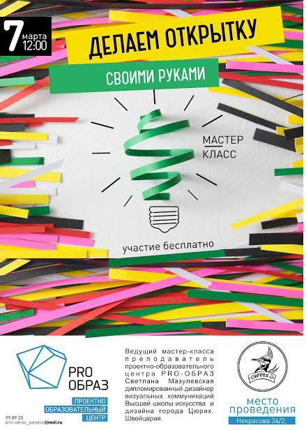 7 марта в 12:00 по адресу ул. Некрасова, д.34/2 состоится мастер-класс «Делаем открытку своими руками». Ведущая мастер-класса – преподаватель проектно-образовательного центра «PRO-ОБРАЗ» Светлана Мазулевская – дипломированный дизайнер визуальных коммуникаций Высшей школы искусства и дизайна (Цюрих, Швейцария).
