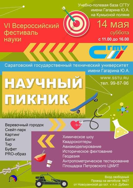 14 мая 2016 года в рамках VI Всероссийского фестиваля науки СГТУ имени Гагарина Ю.А. проводит мероприятие под названием «Научный пикник».