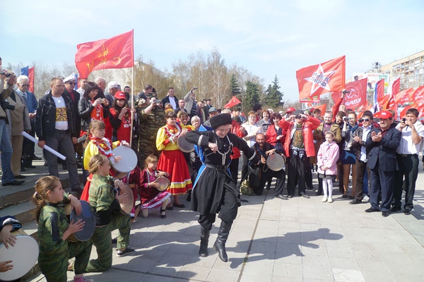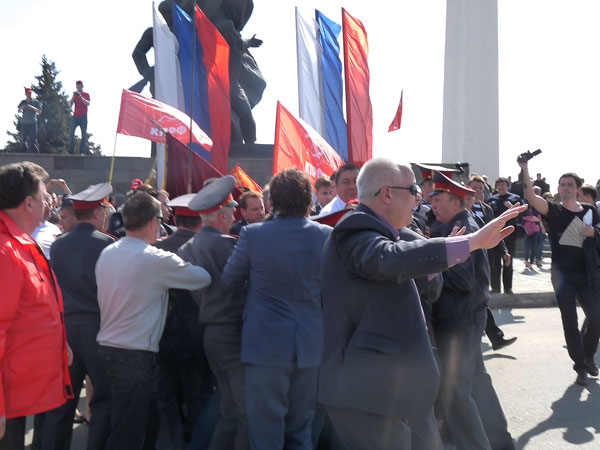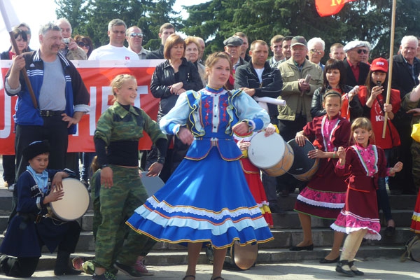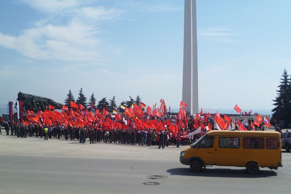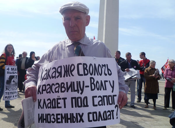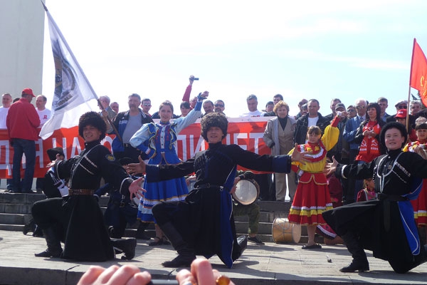Пока на площади собирается народ, прогуливаюсь к парапету, с которого открывается потрясающий вид на Волгу. Со стороны многотысячная толпа больше смахивает на праздничную ярмарку, а не на акцию протеста. Делегаций понаехало из 30 регионов России. Подход каждой встречают овациями. Те тоже не остаются в долгу, выкрикивая речевки и устраивая гам. Всем весело, кроме организаторов, пытающийхся сообразить, как же все-таки лучше разместить такое количество гостей. Из суеты меня выдергивают звуки лезгинки. По саратовской привычке, выработанной на прогулках по проспекту Кирова и походах в ТЦ «Триумф-Молл», оглядываюсь в поисках тонированного автомобиля и группы молодых кавказцев. Ан нет, это осетинская делегация привезла с собой детский ансамбль. Ребятишки танцуют очень неплохо, через несколько минут около них уже плотное кольцо зрителей. Чуть позже им приходится переместиться повыше, а кое-как выстроенная структура построения к чертям ломается. В нескольких метрах от них уныло стоит местный оркестр духовых инструментов. Музыканты бросают недовольные взгляды на коллег, несколько раз пытаются начать «Амурский вальс», но зрителям лезгинка гораздо интереснее.