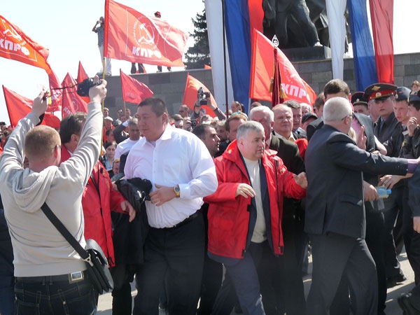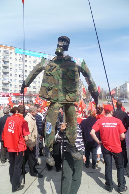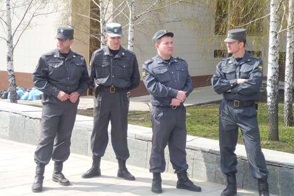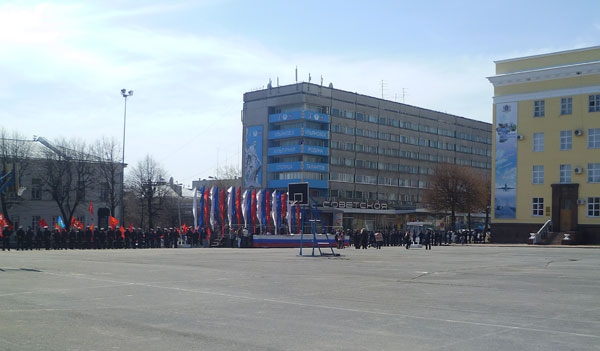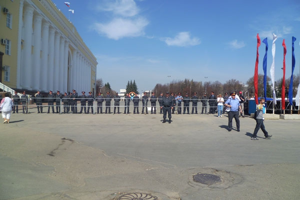 По улице Кузнецова колонна, выкрикивая лозунги и призывая местного губернатора Морозова уйти в отставку, поднимается до площади Ленина. По периметру стоят железные заграждения, за которыми выстроилась цепь полицейских. Неподалеку около автобуса лениво курят омоновцы. «Блин, если они на площадь пойдут, тут будет побоище, это не десяток силовиков матюгами прогнать», – проносится мыслишка, и я ретируюсь подальше от ребят в камуфляже и масках. Однако руководство колонны на конфликт не пошло. В итоге шествие обогнуло площадь через сквер и собралось около памятника Ильичу. Пока там звучат очередные речи, осматриваю пустую площадь, на которой стоит сцена с девочкой, поющей какой-то шлягер перед пятью-шестью зрителями. Подхожу к полицейским, машу удостоверением с надписью «ПРЕССА» и интересуюсь, почему площадь перекрыта для движения. Лейтенант молча смотрит на меня и передвигается на шаг, чтобы перекрыть дорогу на площадь. «У вас тут что, городской праздник проходит?». Никакой реакции. Делаю еще одну попытку: «Где у вас начальство стоит, которое с прессой общается?». Молчит. «В полдень стулья улетают на юг!» – отчаялся я. Он даже не моргает. «Да из чего же вас делают!» – чертыхаюсь и устало плетусь в сторону. Через некоторое время все-таки нахожу местного полковника, соглашающегося со мной поговорить: «Почему у вас по периметру стоят железные ограждения?». «Они еще с зимы остались. Тут каток был», – полковник крутит в руках дорогой мобильник. «А полицейские зачем выстроились за ними?». «А это чтобы не разобрали, – улыбается он. – Организаторам акции маршрут прохождения через площадь не согласовывали».
