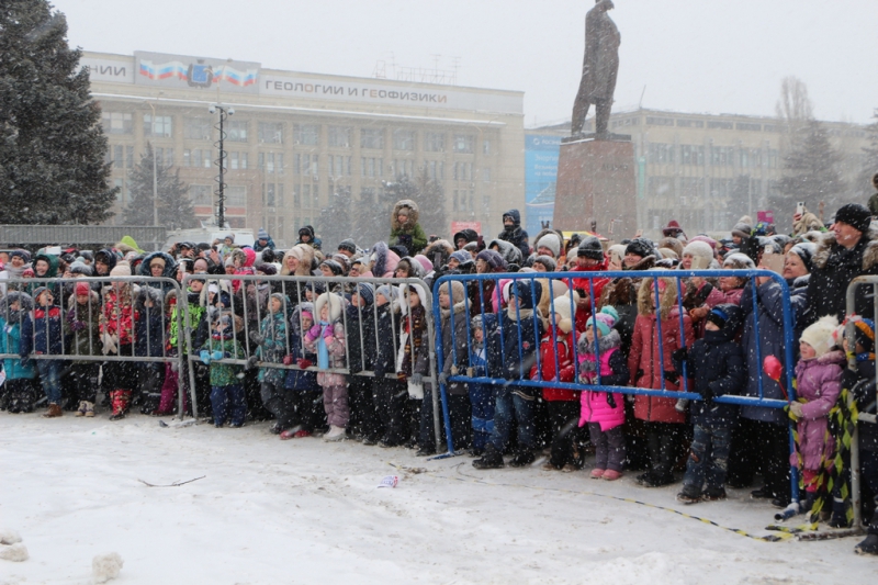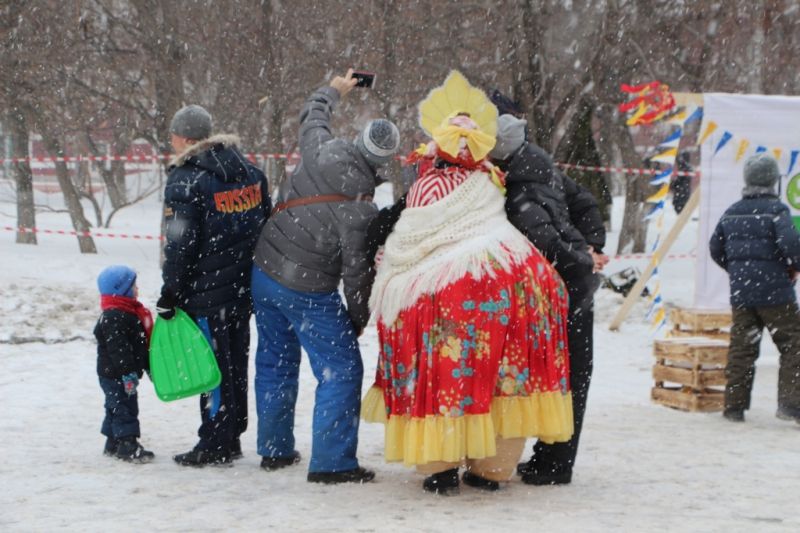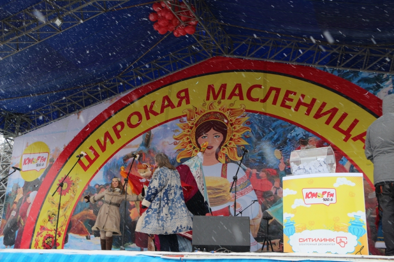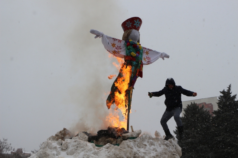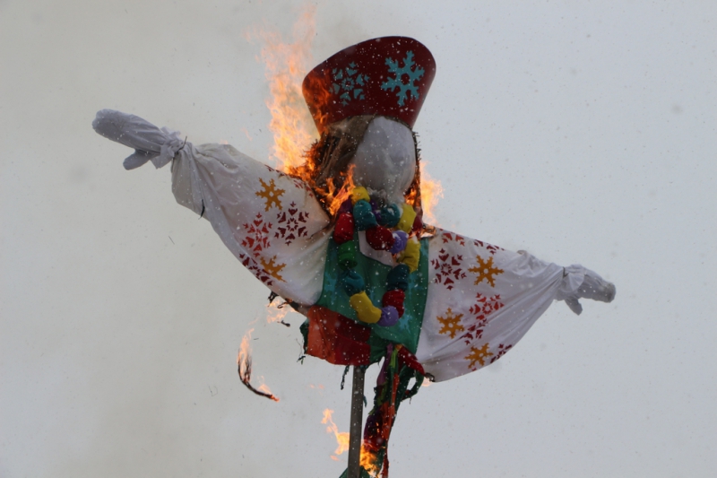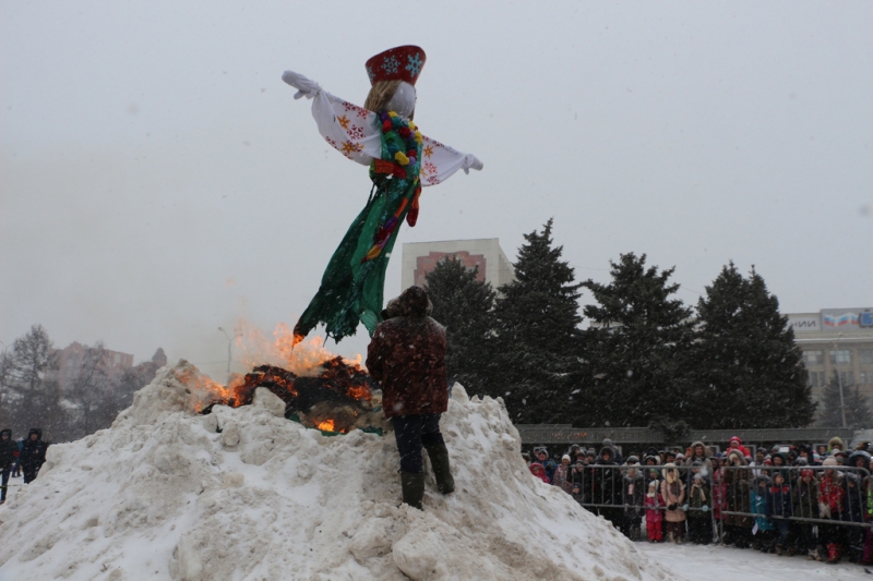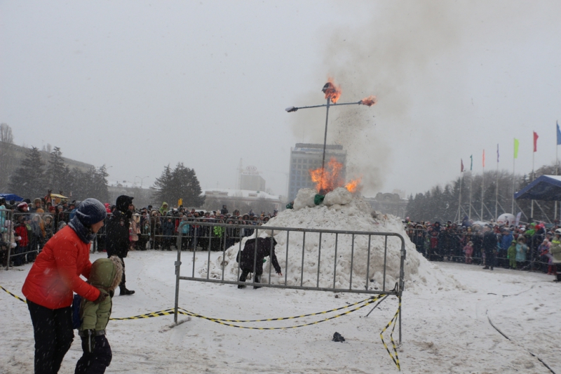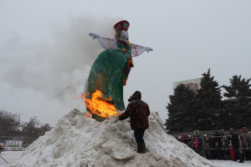 Под конец концерта ведущие объявили о начале проводов зимы сжиганием чучела Масленицы. Горожане окружили установленное в сугробе чучело и стали наблюдать за процессом. В целях безопасности это место оградили железным забором и поставили дежурить работника пожарной охраны. Организаторы обильно облили конструкцию бензином и под радостные крики толпы начали ее поджигать. Однако вспыхнуло только основание, а сама кукла осталась почти невредимой. Тогда мужчина, поджигавший чучело, попытался факелом дотянуться до сарафана Масленицы, но он не загорелся и на этот раз. Спас ситуацию его коллега, который очень близко подобрался к кукле, еще раз полил ее бензином и поднес зажженный факел. На третий раз Масленица сразу же заполыхала.