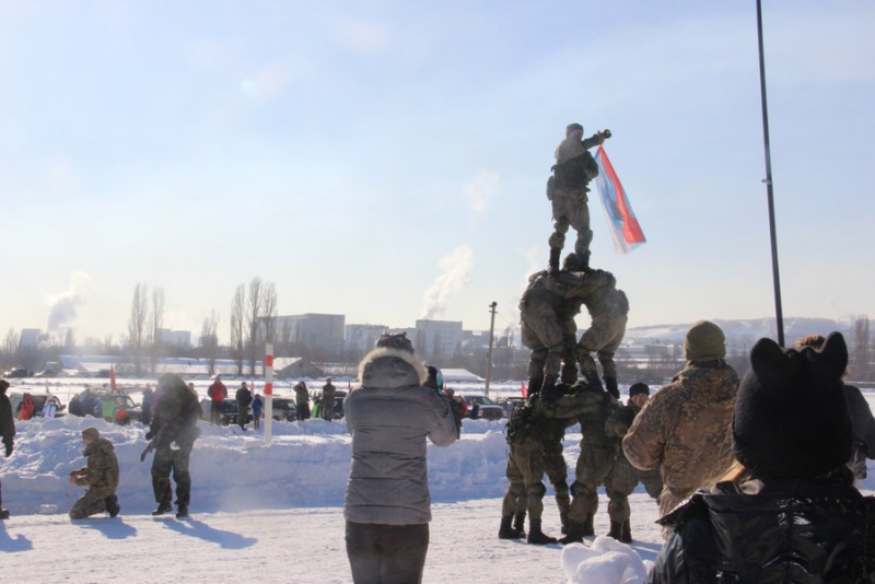 Затем началась основная часть праздника. Сначала бойцы спецназа и ОМОНа продемонстрировали приемы самообороны. Затем они показали элементы акробатики - вскарабкались друг на друга и высоко подняли свой флаг.