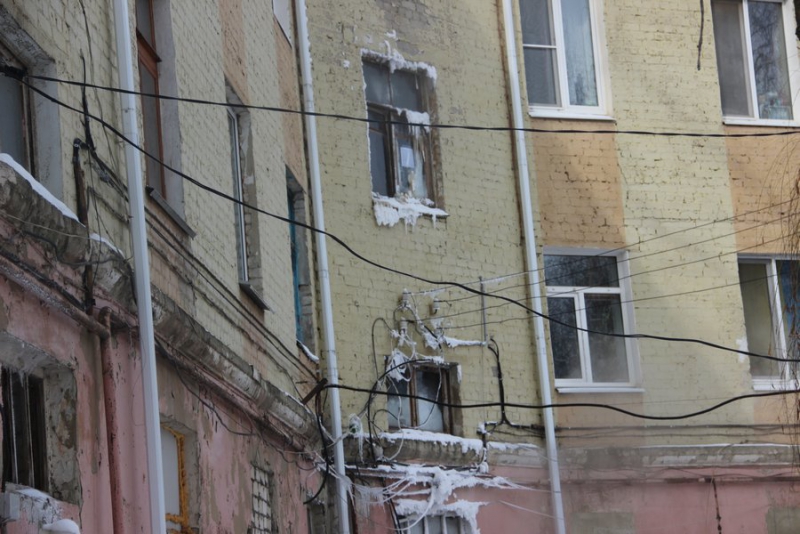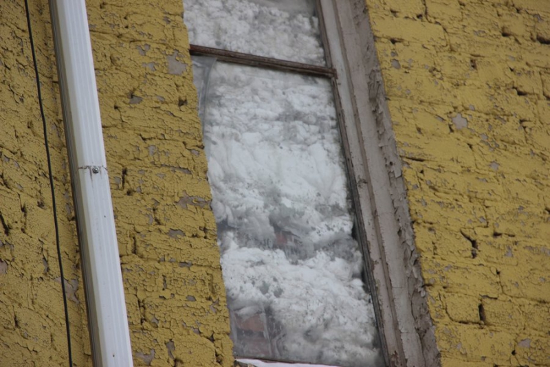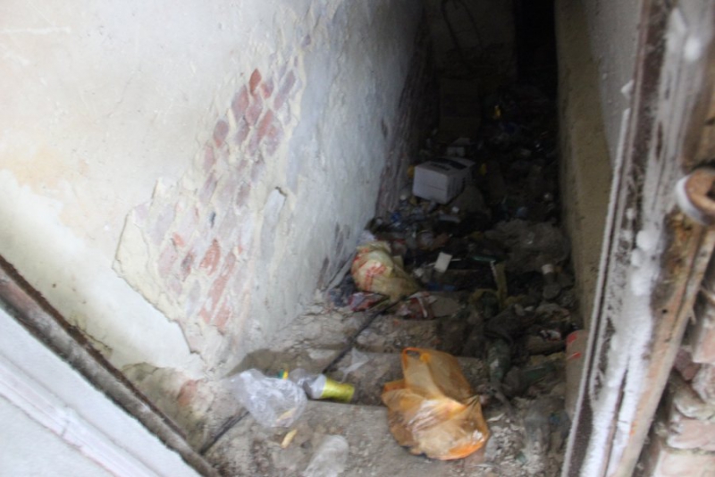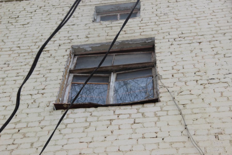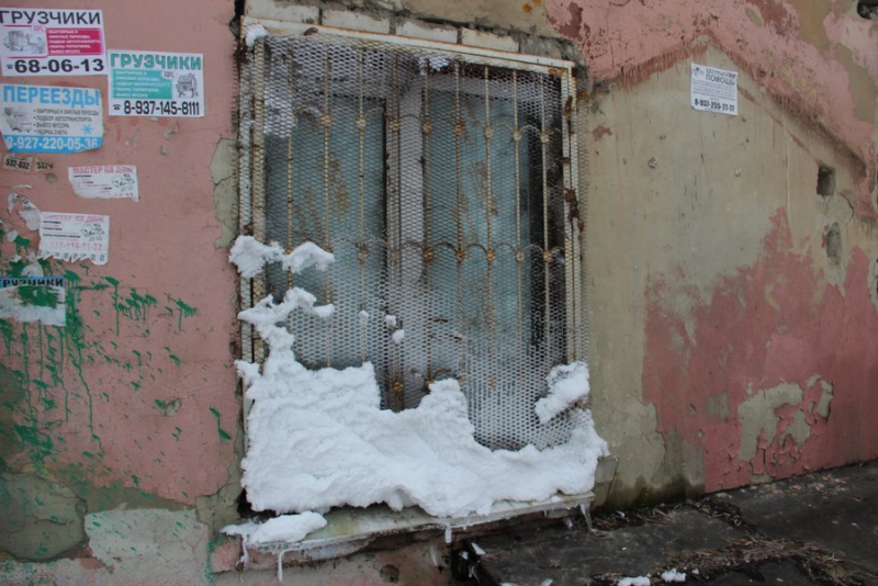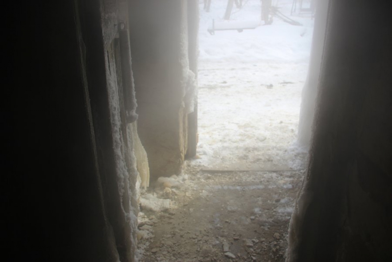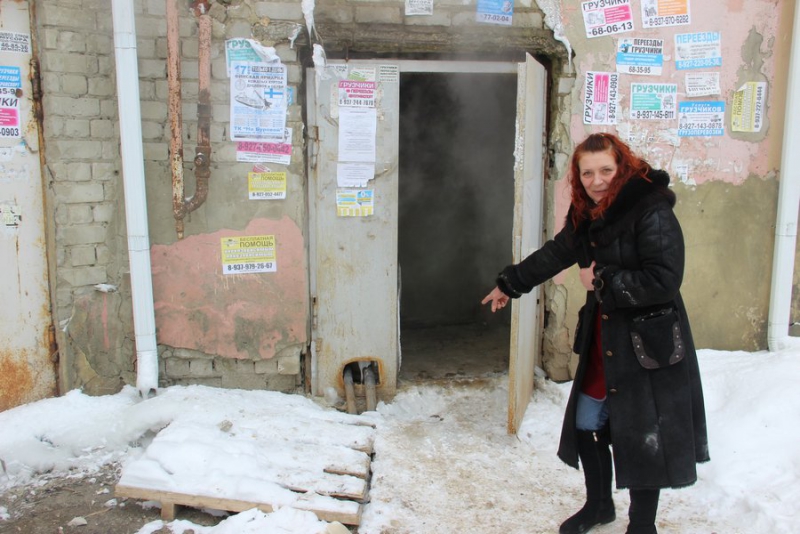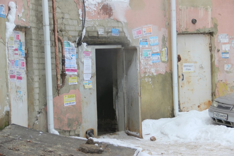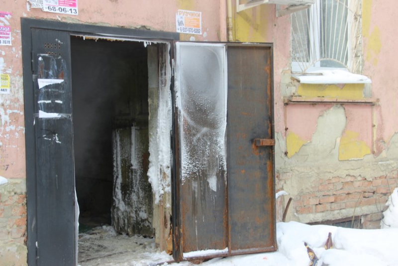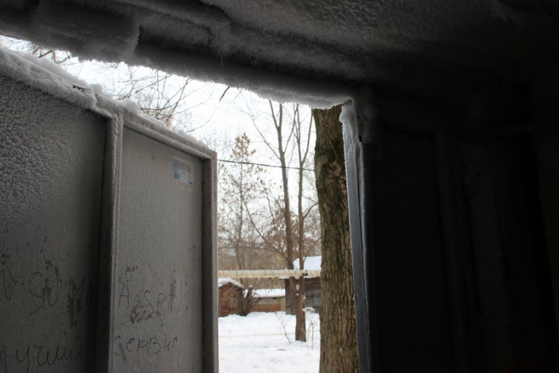 Ужасающая обстановка наблюдается в подъездах. Здесь выбиты стекла, вываливаются оконные рамы, открыты коробки с проводами, не закрывается ни одна железная дверь, ведущая с улицы, и они уже покрылись толстым слоем наледи. В среднем подъезде в двери пропилили отверстие для двух труб коммуникаций. Здесь же в подвале шумит прорвавшаяся вода и стеной стоит пар.