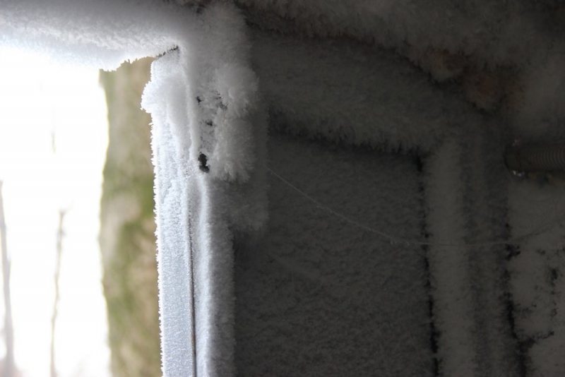 Лед на двери подъезда. Нечеткое фото из-за пара