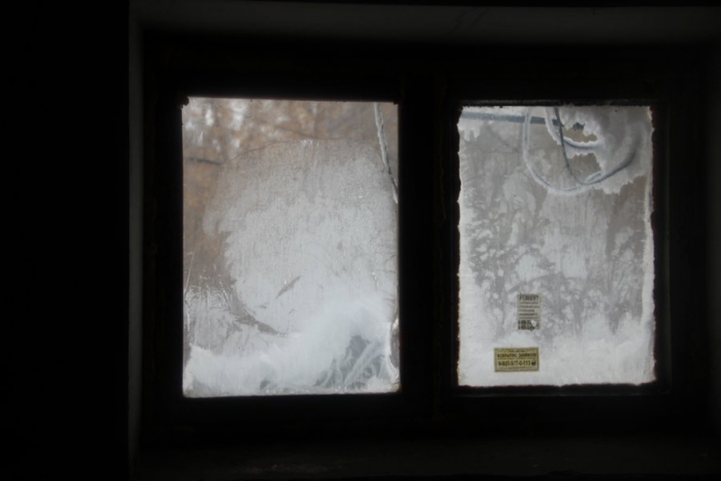 В одном из помещений журналиста встретила молодая семья с двумя маленькими детьми. Они с мамой были в комнате и спасались обогревателем, в то время как глава семейства демонстрировал холодную батарею на кухне, затянутые льдом окна и образовавшиеся на подоконнике снежные наросты.