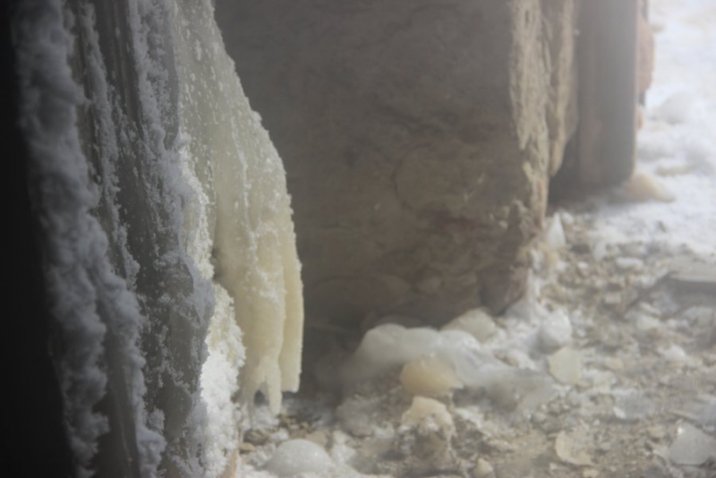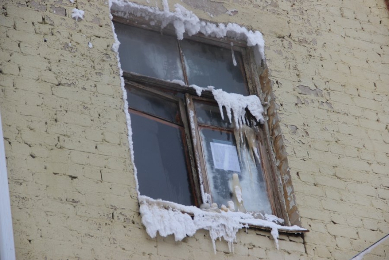 Ситуация с холодными батареями осложняется тем, что здание постоянно заливает водой из котельной на крыше, и сейчас в квартирах влажно. В итоге люди мерзнут, а стены дома покрываются льдом.