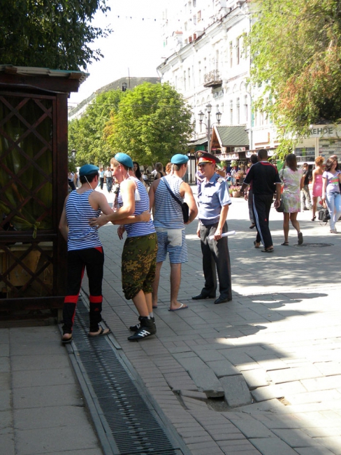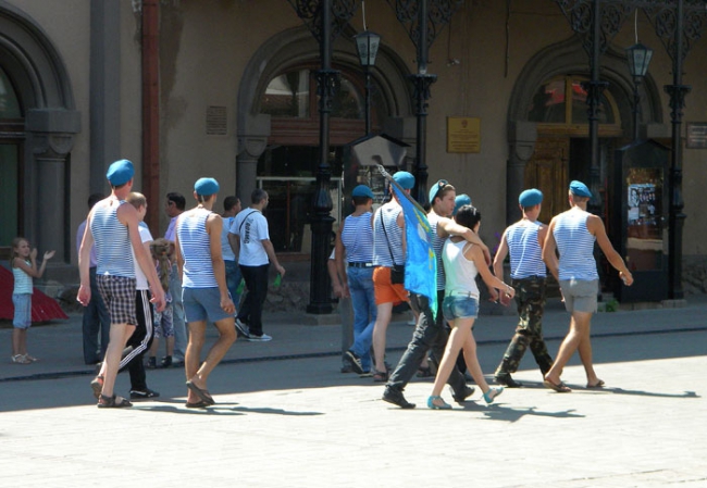 Помимо отключенных фонтанов, около которых обычно собираются ветераны ВДВ, взгляд журналиста привлекли усиленные меры безопасности. Так, только на площади Кирова несут службу порядка 10 полицейских. Сами десантники ведут себя спокойно, лишь периодически выкрикивают: «Слава ВДВ!». Также по городу передвигаются автомобили с флагами войск «Дяди Васи».