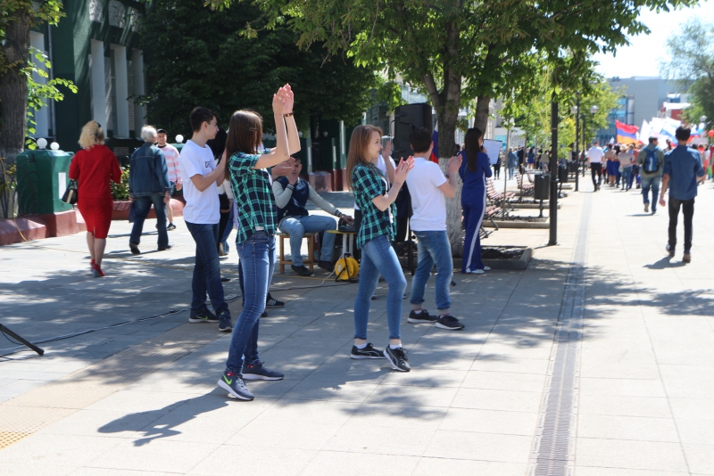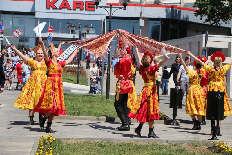 Толпу встречали танцевальные народные и вокальные коллективы, расположившиеся на временных сценах по всей пешеходной зоне. В частности, саратовская группа «Любители этого дела» исполнили песню группы «АнимациЯ» «Я люблю свою родину».