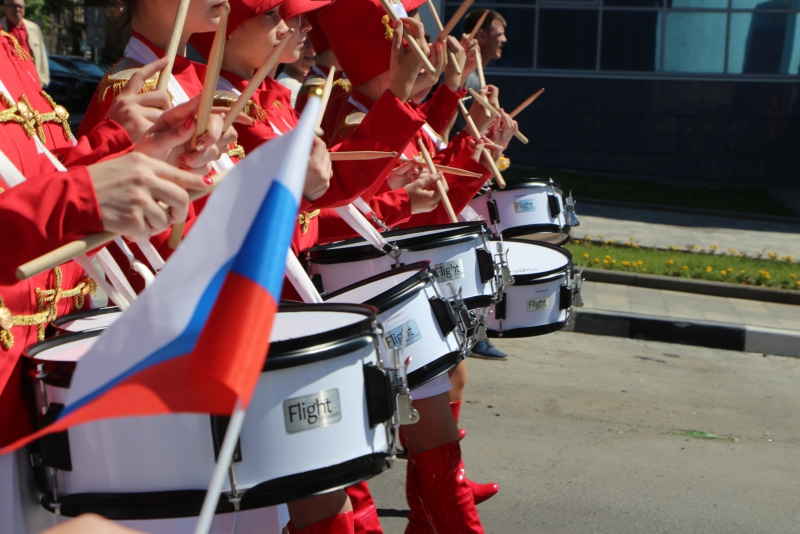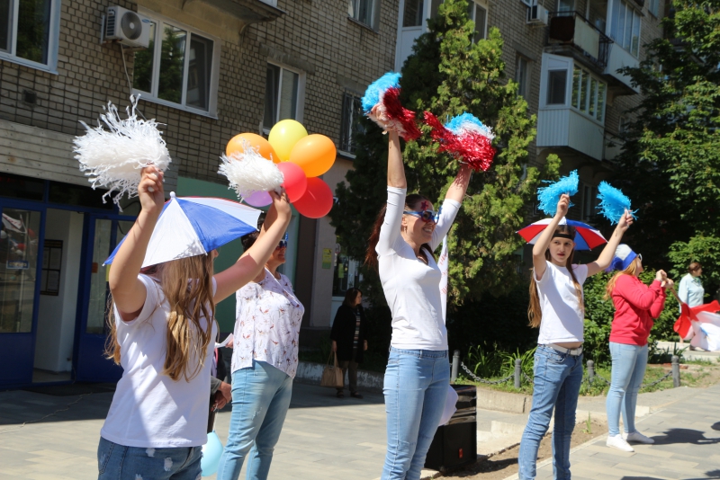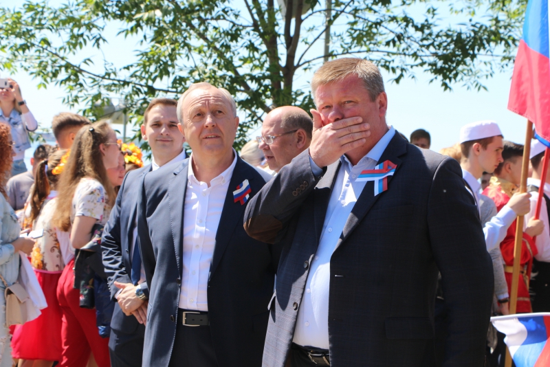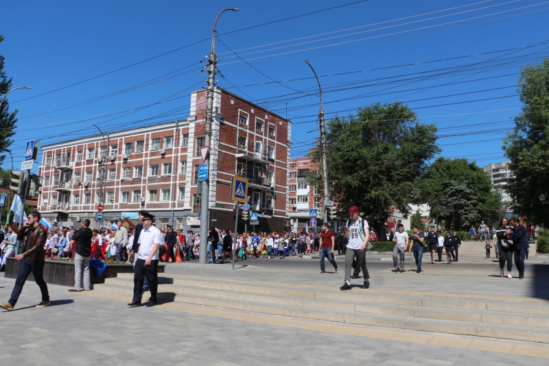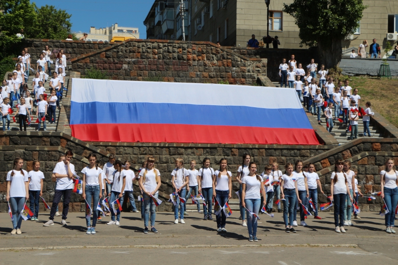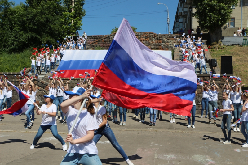 Завершился парад на набережной у спуска с улицы Некрасова. Там участников шествия встречали дети с флагами РФ в руках, а на подъеме к верхнему ярусу развернули огромное полотно с триколором.
