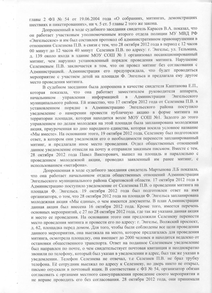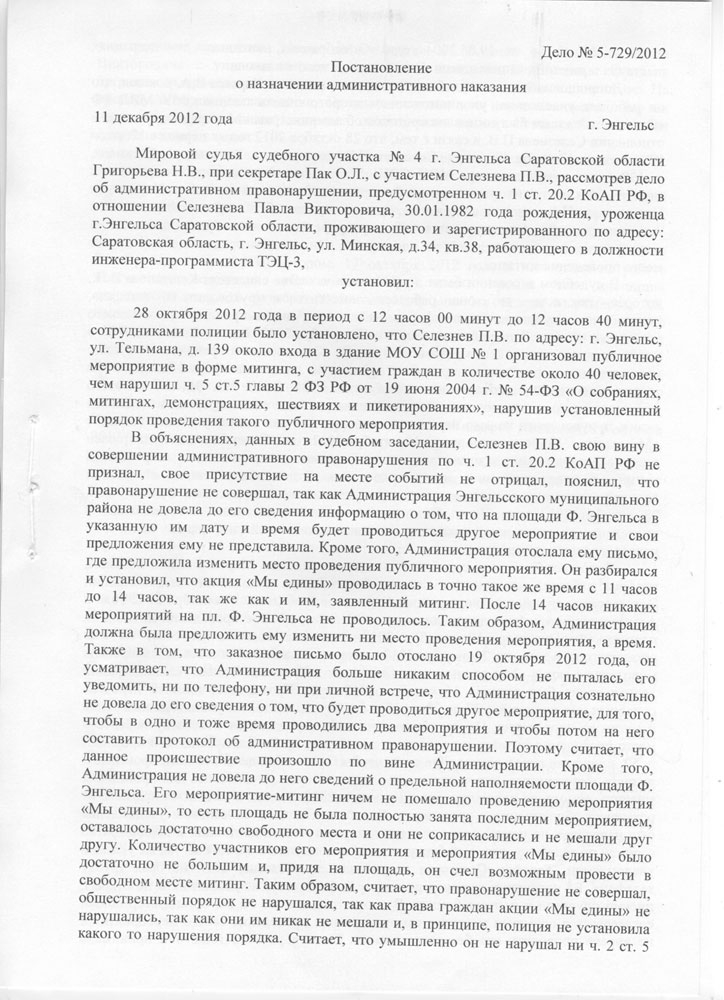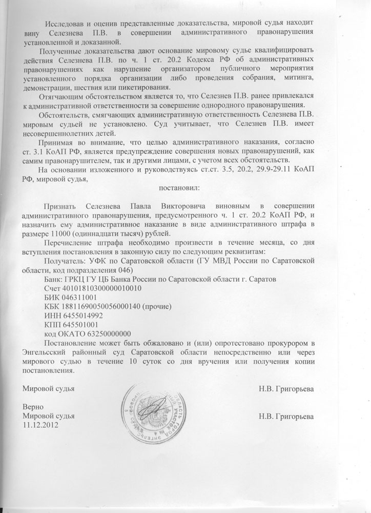 Суд признал виновным депутата Энгельсского районного собрания Саратовской области Павла Селезнева в нарушении организации публичного мероприятия и оштрафовал его на 11 тысяч рублей. При этом наказание могло быть более суровым, но судья учла смягчающее обстоятельство - наличие у Селезнева несовершеннолетних детей.