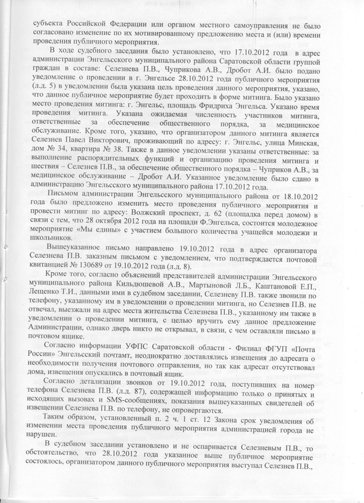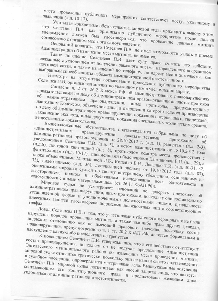 Мировой судья пришла к выводу, что Павел Селезнев как организатор публичного мероприятия после подачи уведомления должен был удостовериться в согласовании митинга. Кроме того, оснований полагать, что депутат не имел возможности узнать о письме администрации, не нашлось. Такое поведение Селезнева посчитали уклонением от получения заказного письма как способ избежать ответственности.