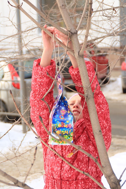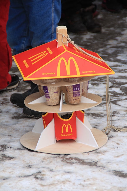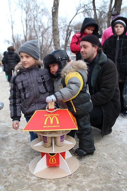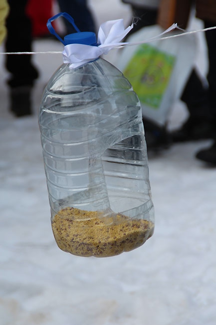 Как только официальная часть завершилась, под пристальным контролем родителей и педагогов дети пересекли дорогу от школы к аллее и принялись развешивать поделки на веревки, растянутые между деревьев. Ажиотаж вызвала кормушка, сделанная из оберток и стаканчиков от продукции компании Макдоналдс.