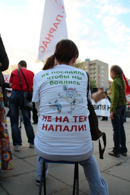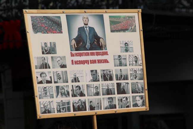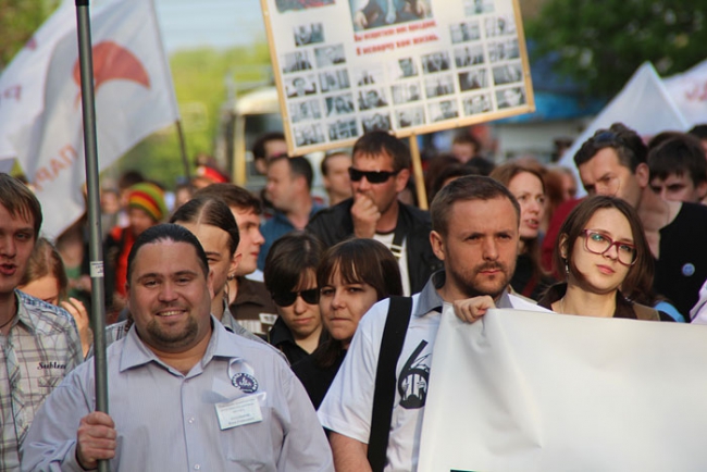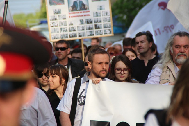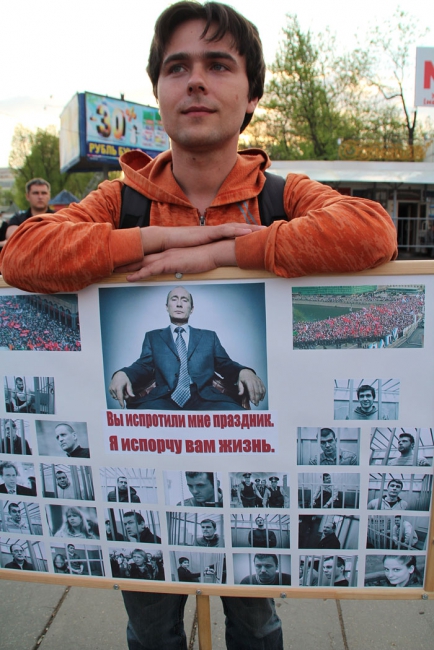 Вчера в центре Саратова состоялось массовое шествие в поддержку всех политических заключенных России. Более сотни оппозиционеров с флагами и плакатами в руках прошлись по проспекту Кирова от консерватории до здания Крытого рынка. При этом они ничего не скандировали, и, видимо, поэтому несколько десятков полицейских не предпринимали попыток вмешательства. Исключением стало только задержание экс-координатора СОИ Михаила Шаповалова за плакат с фамилией Путина.