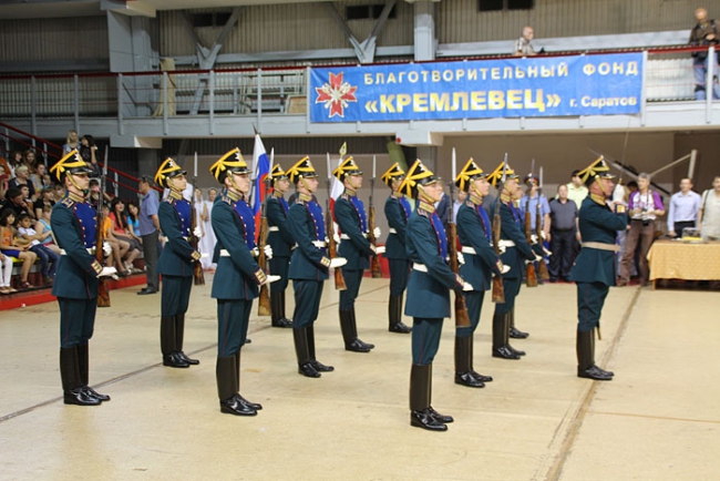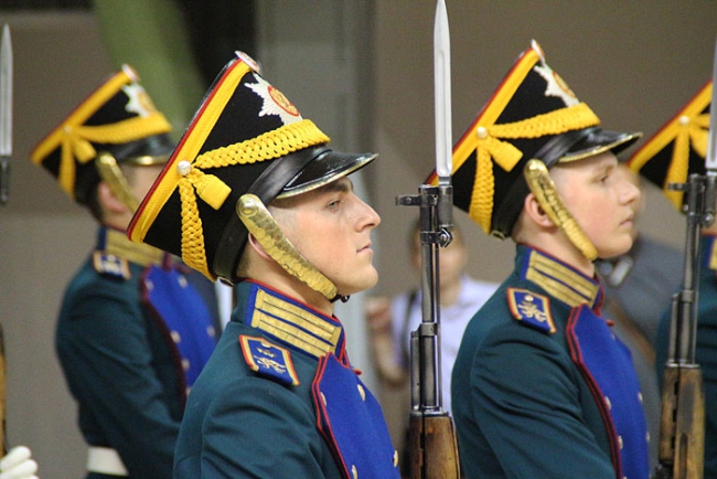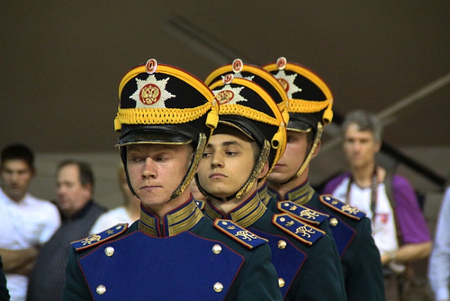 Далее, на сцене появились солдаты срочной службы Кремлевского полка, которые продемонстрировали публике настоящее шоу. Бойцы элитного подразделения на протяжении пяти минут чеканили шаг, и показывали виртуозное умение обращаться с оружием.