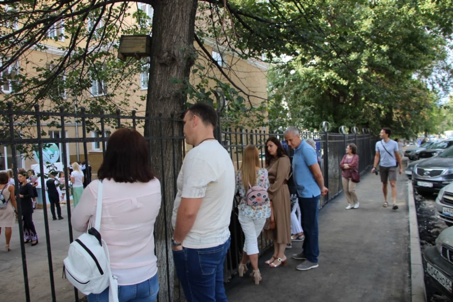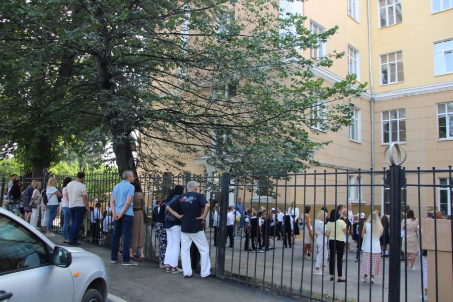 В гимназии №2 на Чернышевского детей сначала завели на территорию, а затем отправили внутрь учебного заведения для торжественного мероприятия. Родители остались ждать своих чад на улице за периметром. Они наблюдали за детьми через забор, взявшись руками за прутья.