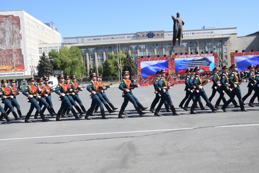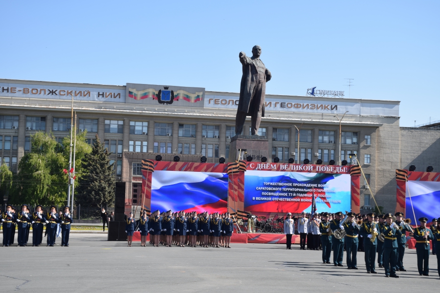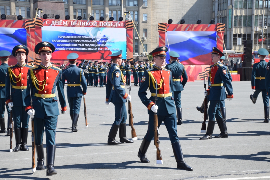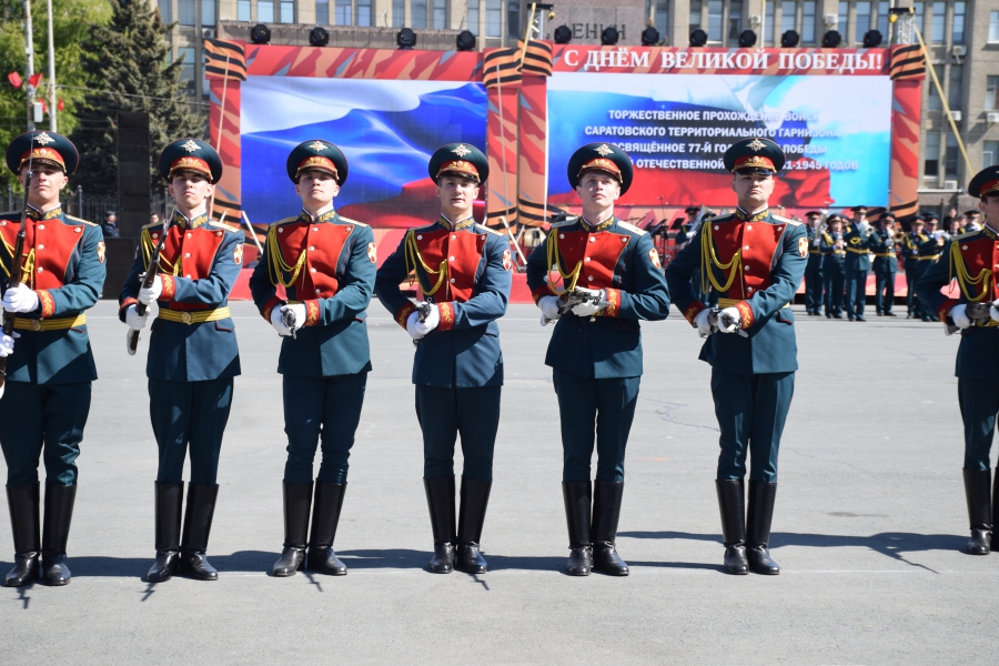 Сегодня на Театральной площади в Саратове тысячи горожан наблюдали за торжественным прохождением войск Саратовского гарнизона в честь 77-летия Великой Победы.