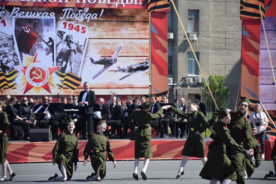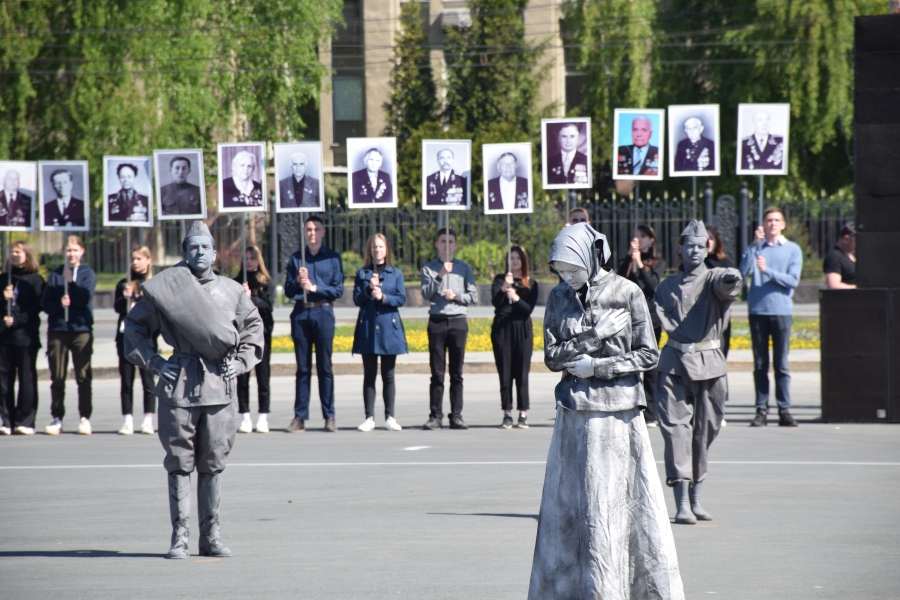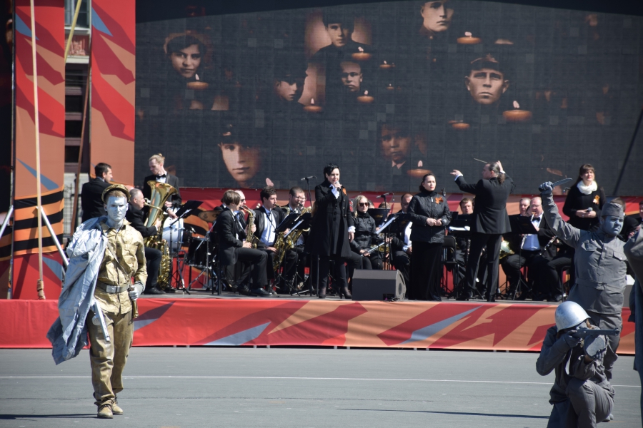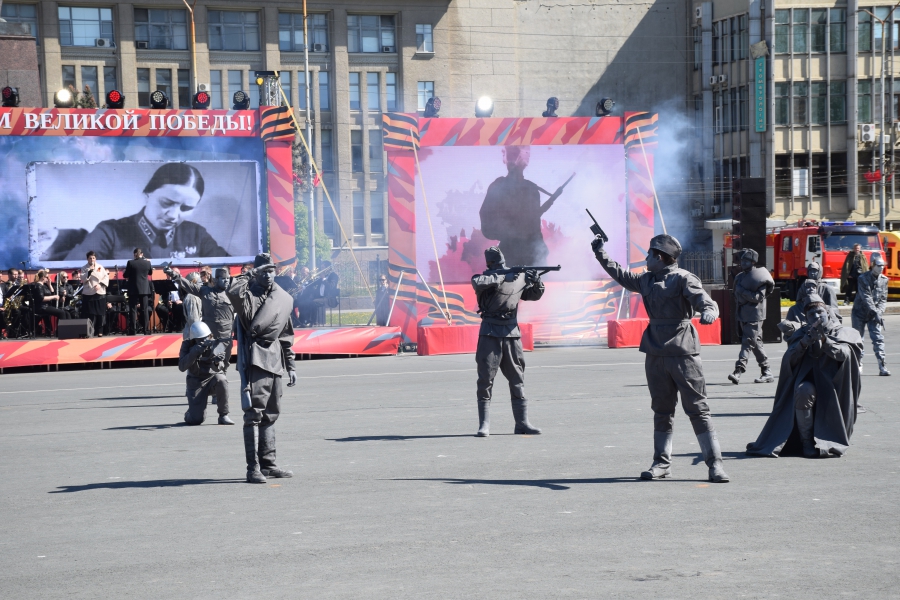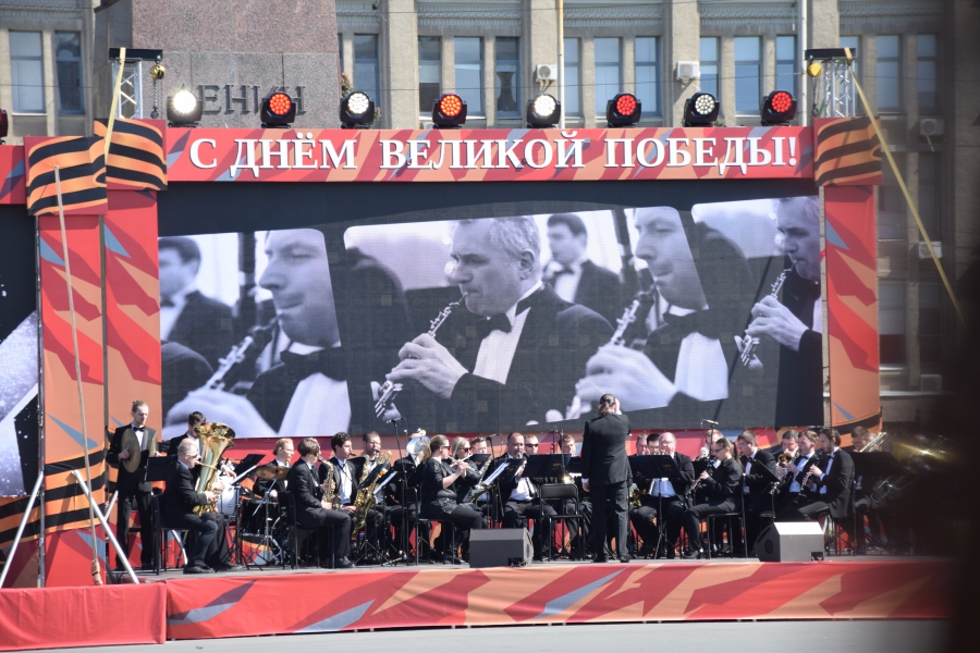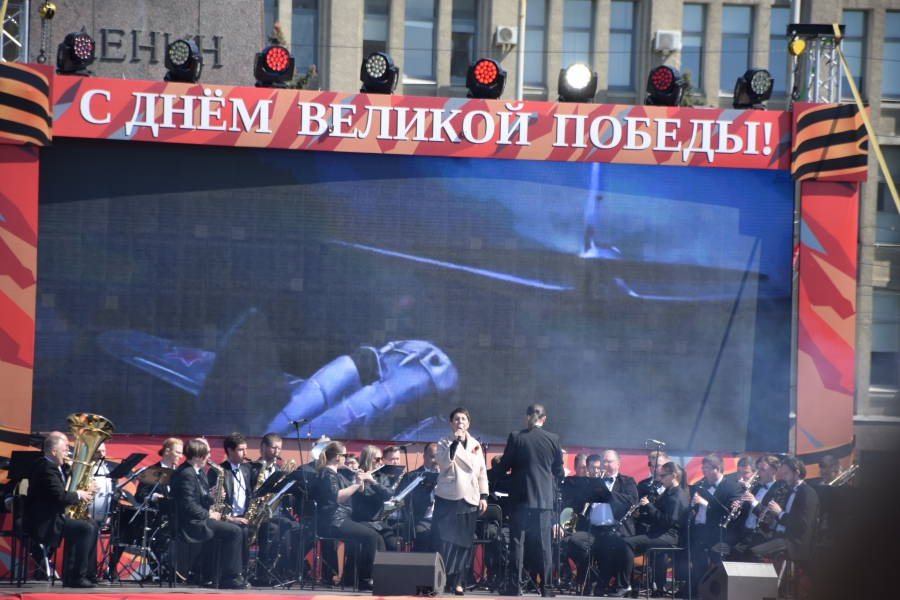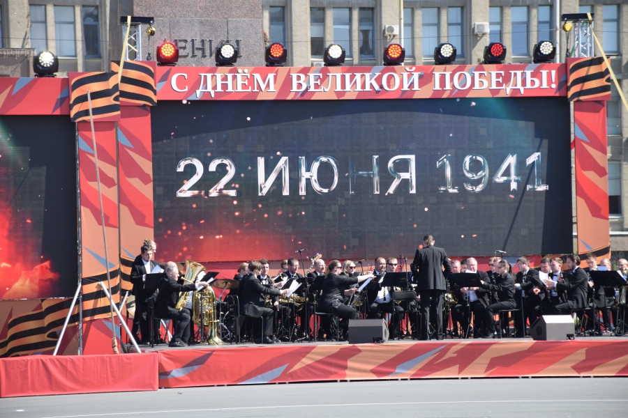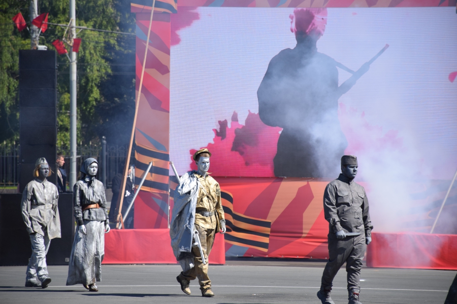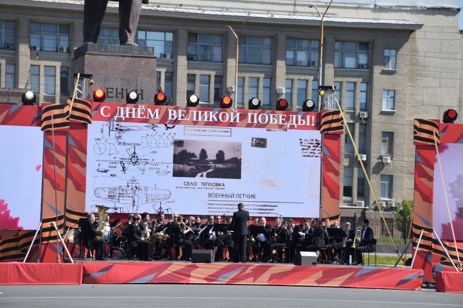 На Театральную площадь вынесли копию Знамени Победы, звучал Гимн России и песни военных лет. Все это праздничное действо переплелось с сегодняшней повесткой: в ходе концерта юнармейцы вынесли гигантскую Георгиевскую ленточку и выстроились буквой «V» - один из символов спецоперации на Украине. В своей речи губернатор Валерий Радаев также напомнил о героях, борющихся в эти дни с нацизмом в соседней стране.