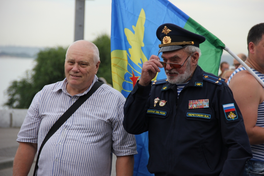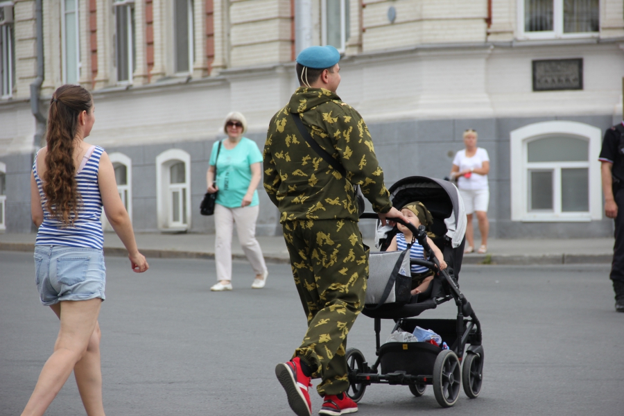 Традиционно празднование сопровождается проездом боевых машин, но сегодня БТР и прыжков с парашютами не было. Военнослужащие также не купались в Волге, но внимание горожан привлекли патриотическими концертными номерами.