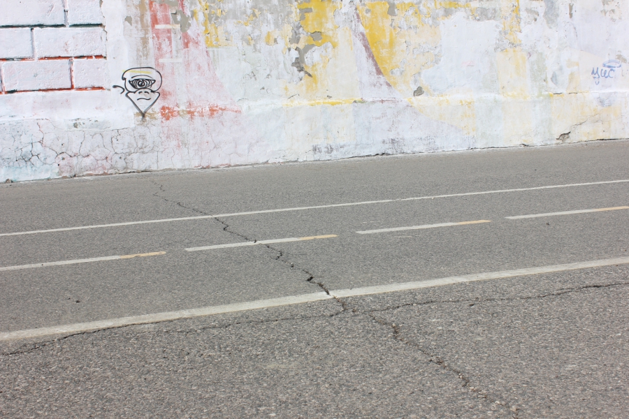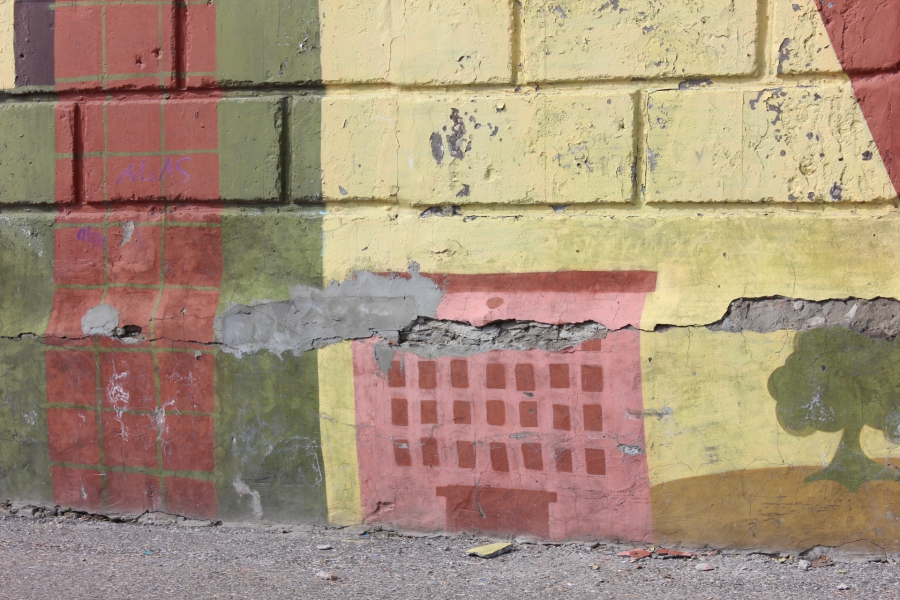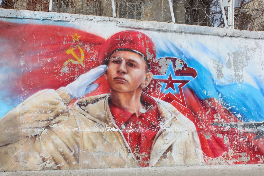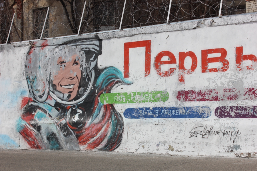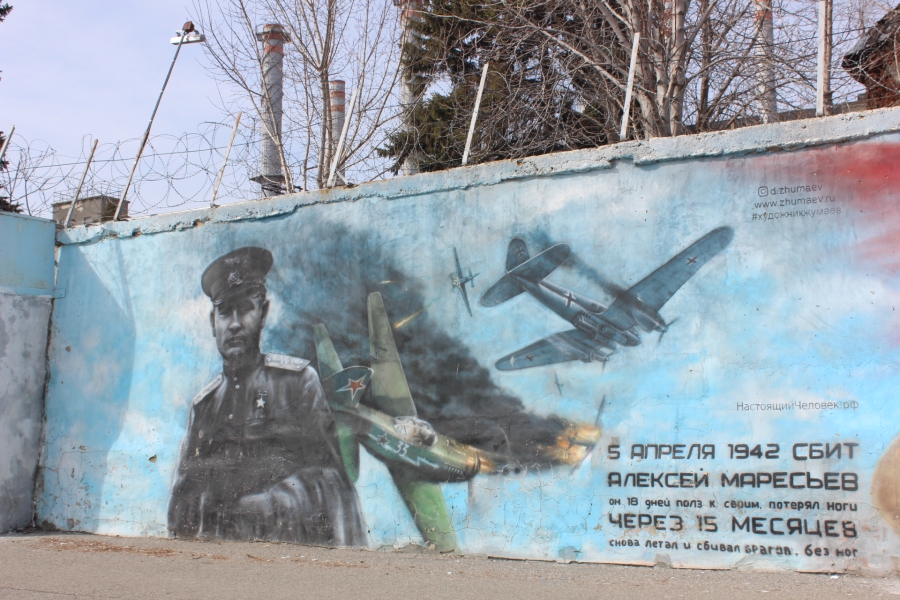 Отдельно стоит сказать о состоянии граффити. Среди нескольких настенных рисунков в относительно нормальном виде сохранилось только недавно обновленное изображение летчика Алексея Маресьева. Чуть лучше сохранилось изображение мальчика-юнармейца, чего не скажешь о портрете космонавта Юрия Гагарина: краски сильно потускнели, во многих местах отвалились. Примечательно, что в этом году отмечается 90-летие со дня рождения Гагарина, также уже буквально на носу годовщина первого полета человека в космос. Портрет Юрия Гагарина, как и несколько других тематических граффити, плохо пережили зиму, несмотря на то, что их нарисовали только прошлой осенью.