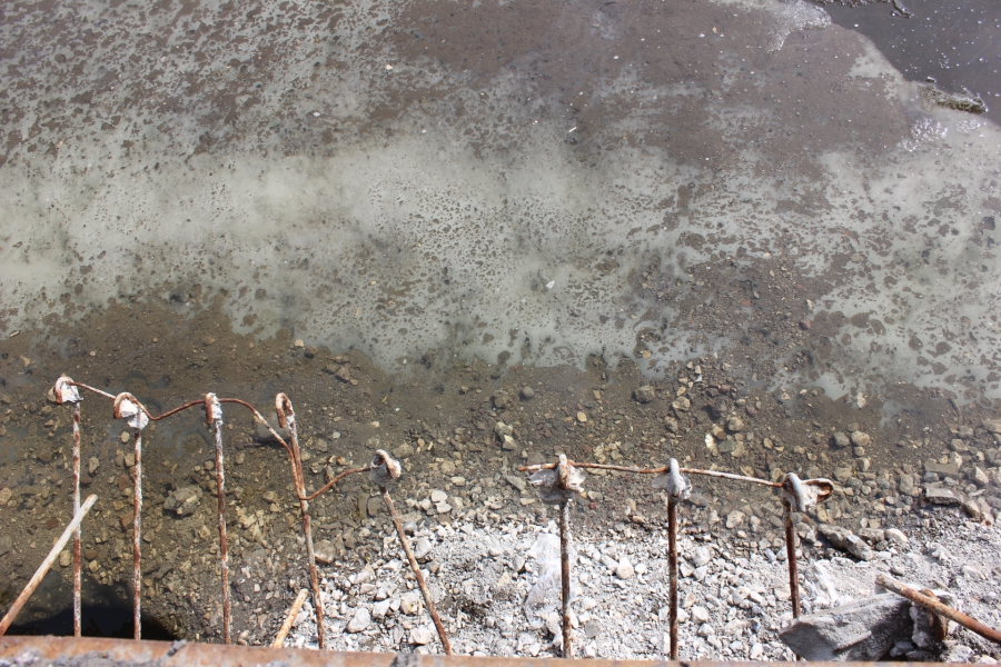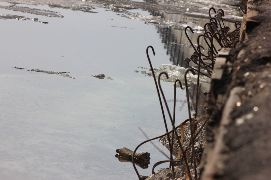 У края воды - отвалившиеся куски причала. Если посмотреть со стороны, то видно, что подпорная стенка продолжает разрушаться: части фундамента напирают на выбившиеся из конструкции металлические основания. Сложилась опасная ситуация, ведь здесь к воде любят спускаться взрослые и дети. Может наступить момент, когда-то кто из них упадет в реку из-за обвалившейся части стенки. Причем человек при падении вполне может напороться на выступающи металлические штыри. Похоже, здесь требуется не косметический ремонт штукатуркой, а основательные работы.