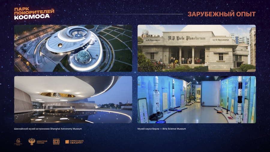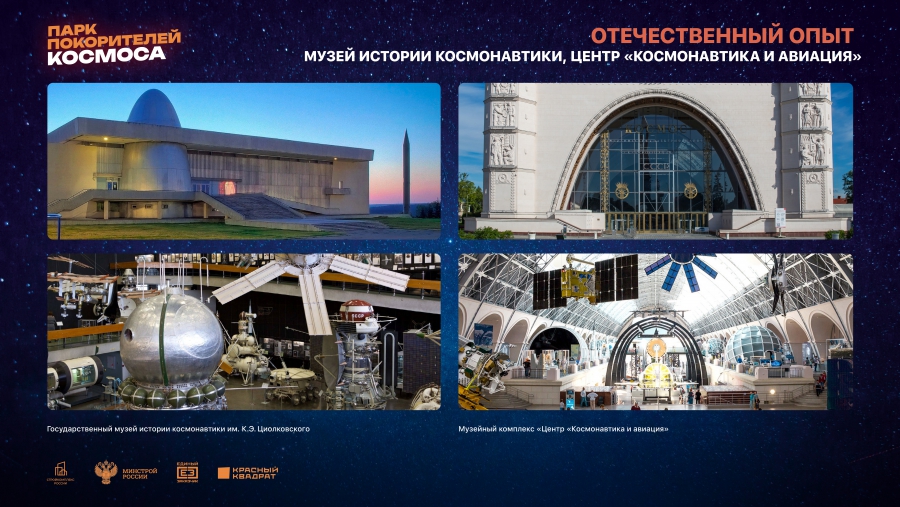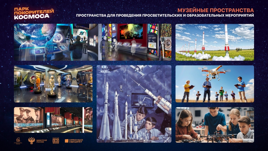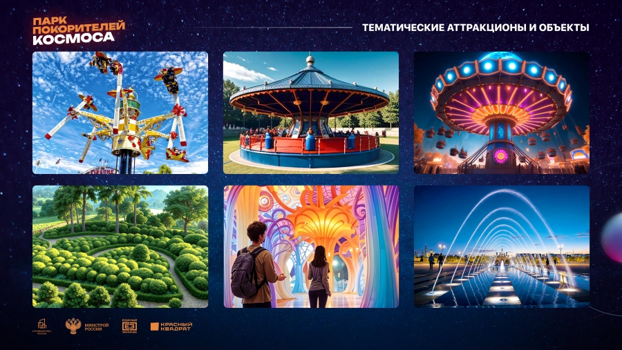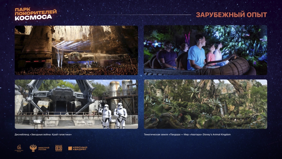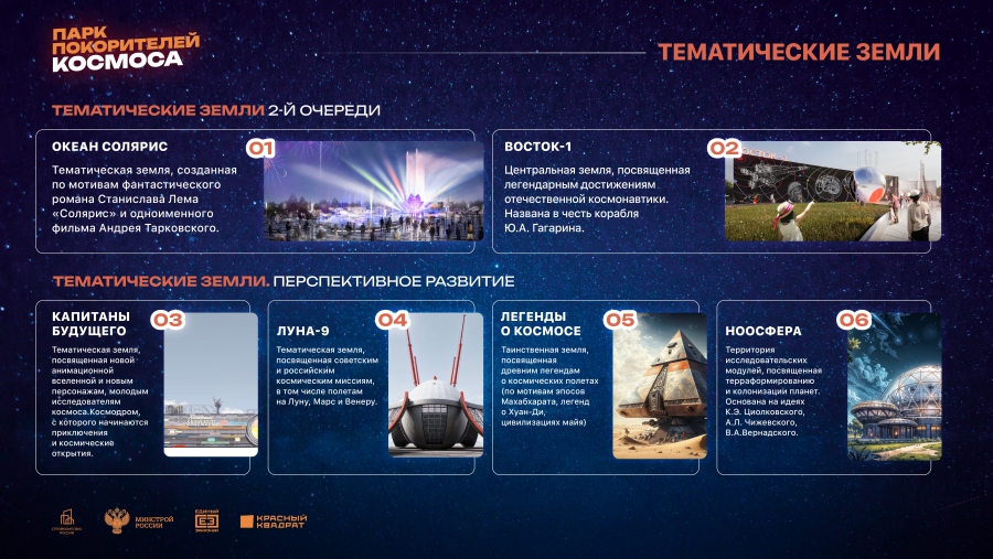 В зоне «Луны-9» сделают фрагмент Луны, воссоздадут космические миссии СССР и сделают их для посетителей парка интерактивными. В зоне «Легенды о космосе» посетителям парка будут рассказывать о древних легендах о космосе. В зоне «Ноосферы» предполагаются научные опыты, например, выращивание растений в невесомости.