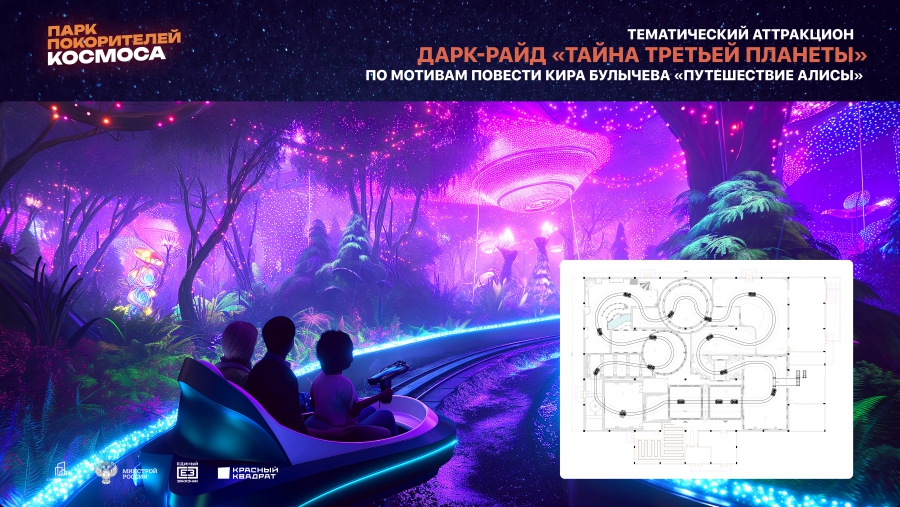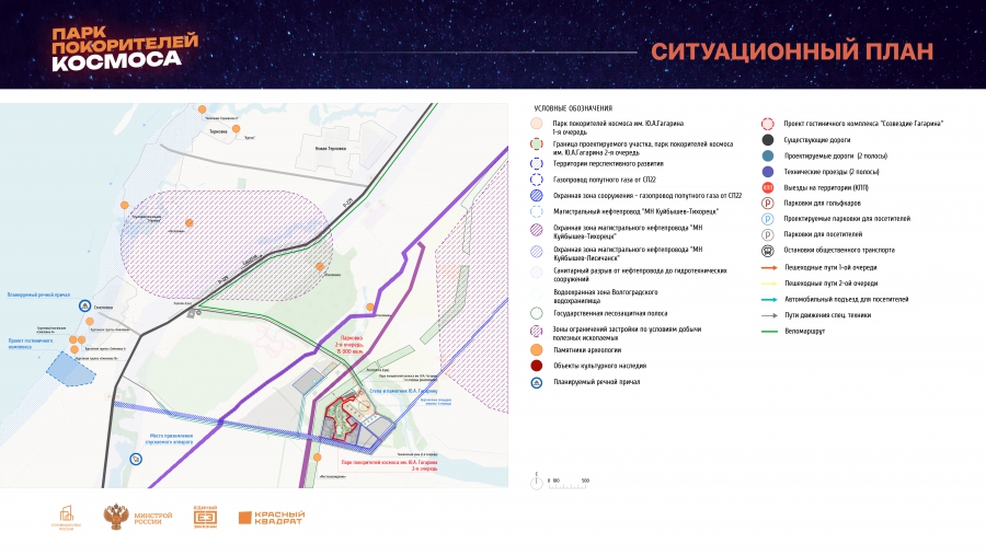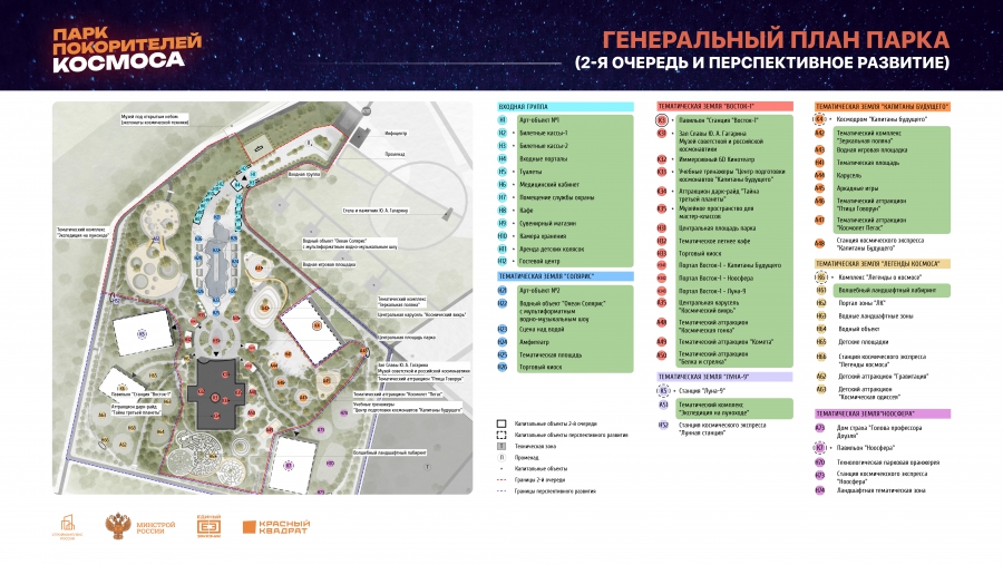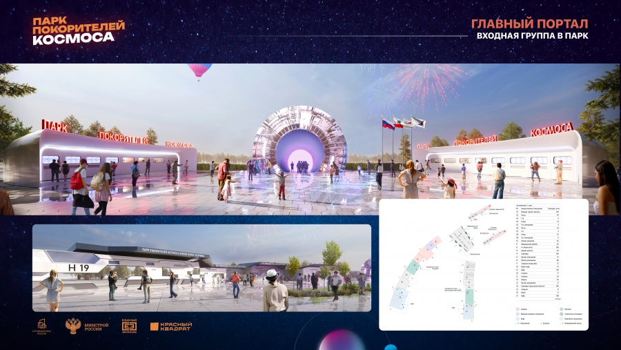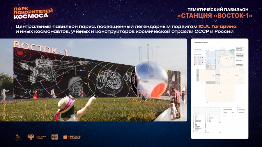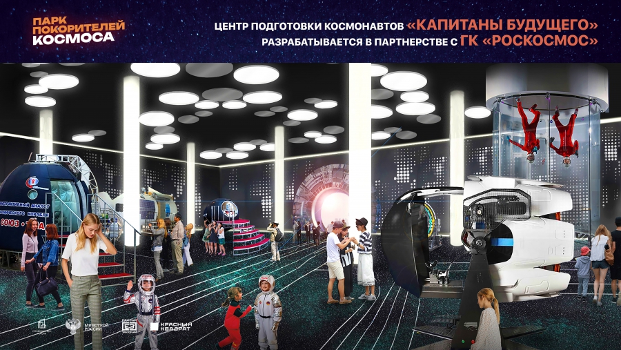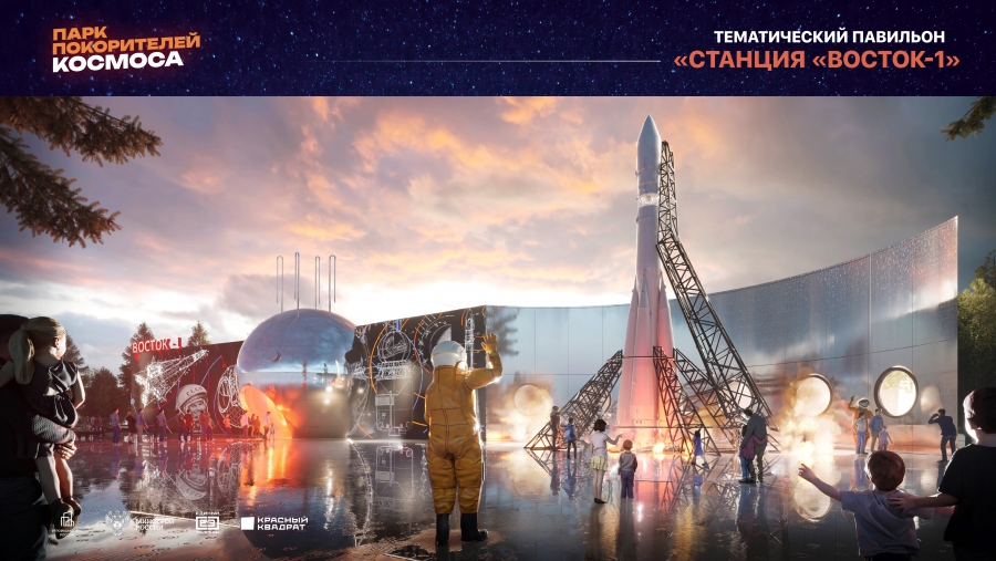 По проекту парк разделят на шесть зон: «Солярис», станция «Восток», «Капитаны будущего», «Луна-9», «Легенды о космосе», «Ноосфера». Первая зона – это вход, который, судя по картинке, будет напоминать дверь космического корабля. В зоне «Востока» сделают музей, посвященный Юрию Гагарину, тут будет центр парка, посвященный истории. Здесь же появится «Центр подготовки космонавтов» с тренажерами, где гости парка попробуют на себе тренировки космонавтов. Там предполагается симулятор невесомости.