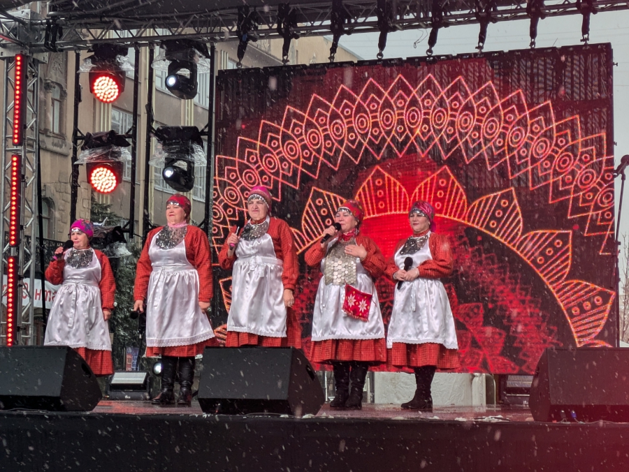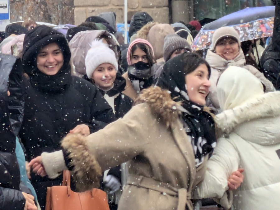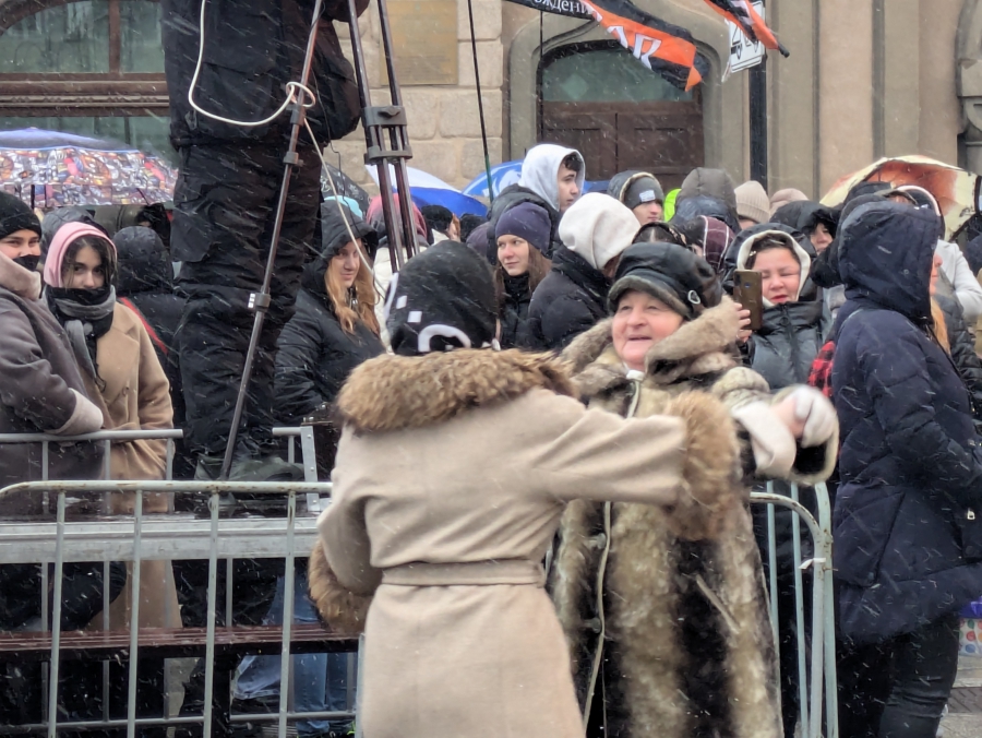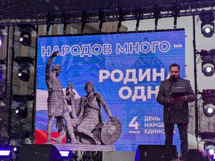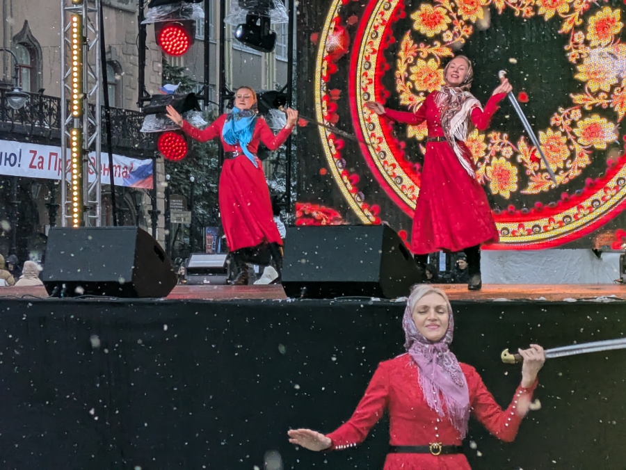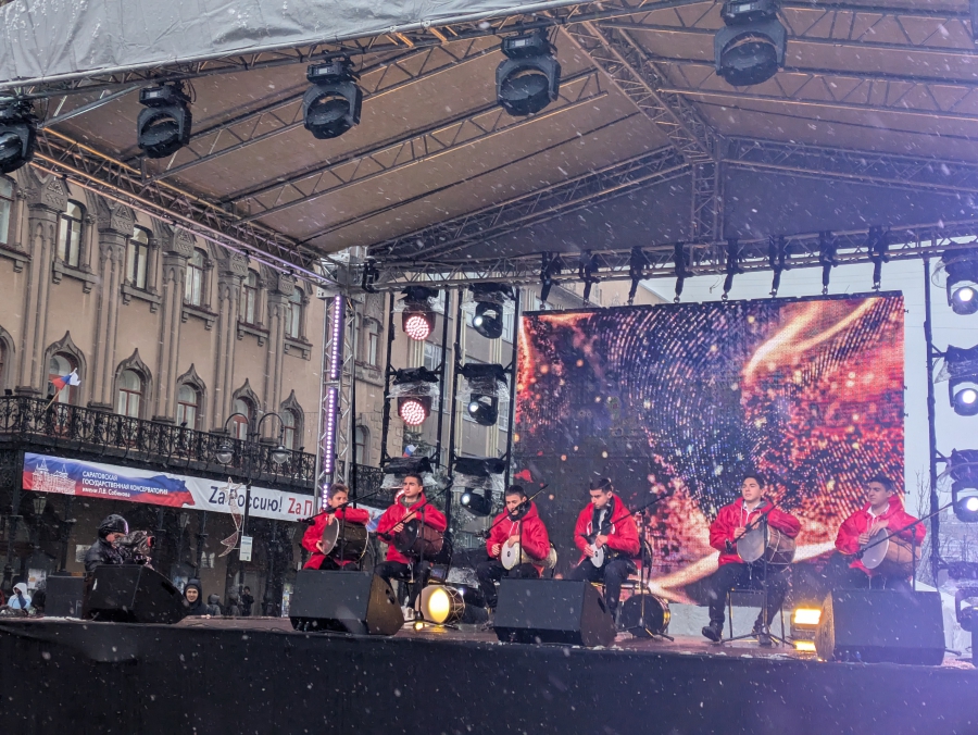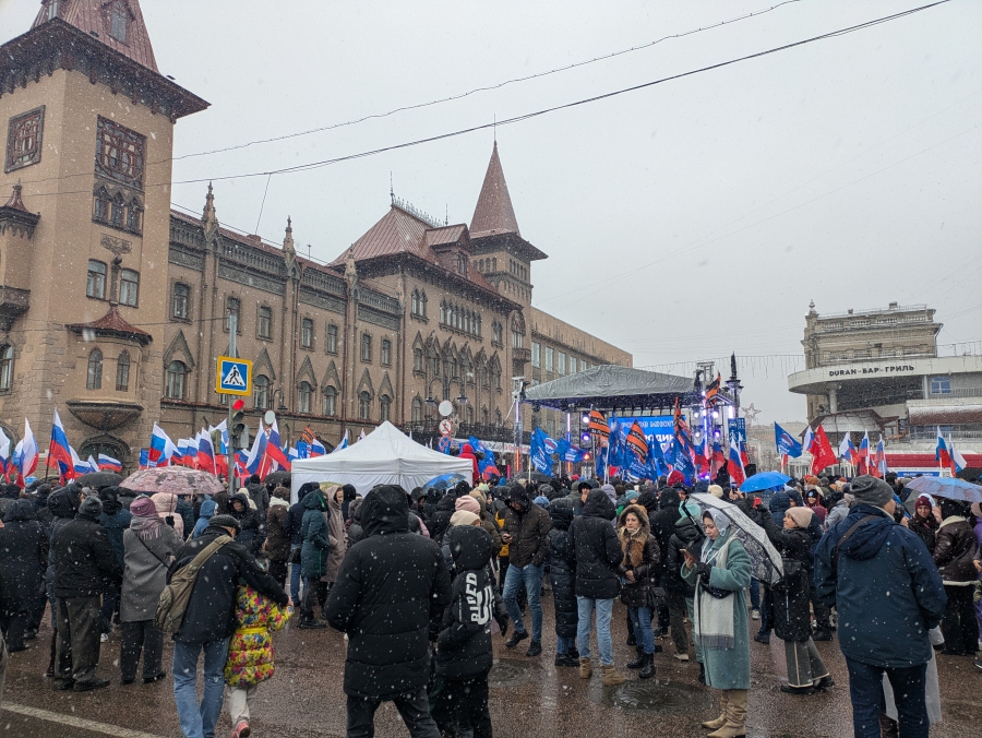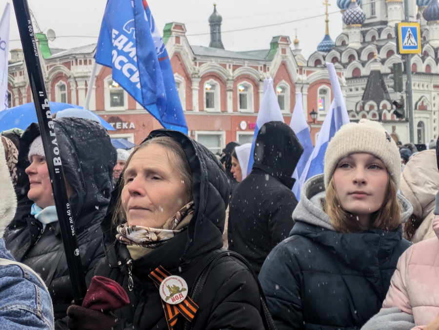 Не смотря на мокрый снег, собрались студенты с флагами, саратовцы разных возрастов, даже пришли с детьми. Во главе зрителей у сцены стояли губернатор Роман Бусаргин, спикер облдумы Алексей Антонов, и.п. мэра Саратова Павел Сурков. По одаль в толпе стояли несколько депутатов. Все кучно стояли и смотрели номера. Когда вип-персоны ушли, места стало больше, у сцены немного промерзшие зрители стали танцевать. В конце праздничного представления остались самые стойкие патриоты.
