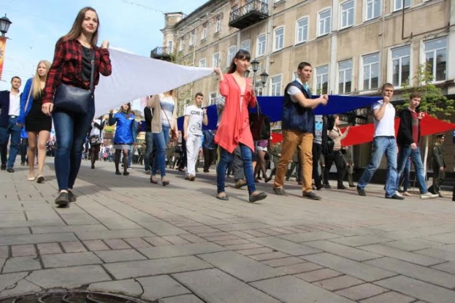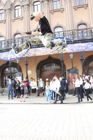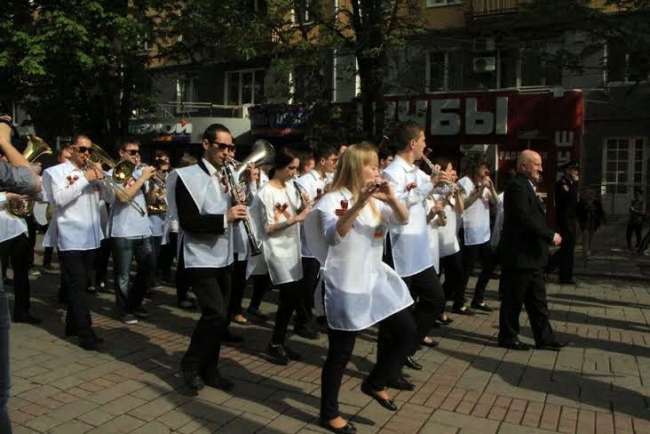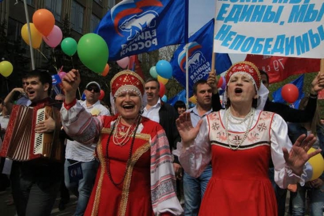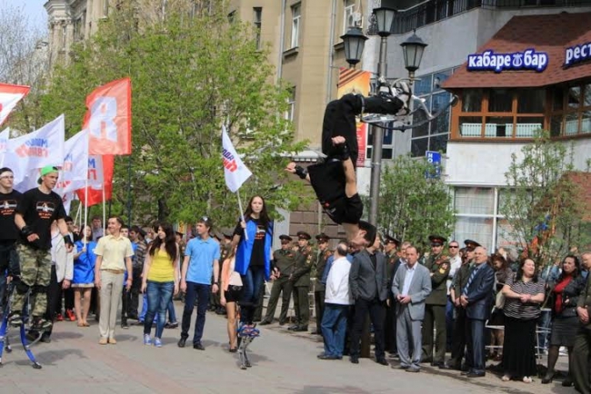 Некоторые представители муниципальных районов, одетые в русские народные костюмы, привлекали внимание прохожих песнями военных лет под гармошку. А активисты «Молодой гвардии» решили развлечь публику трюками джамперов, которые по ходу следования колонны исполняли акробатические движения в воздухе.