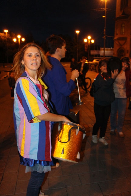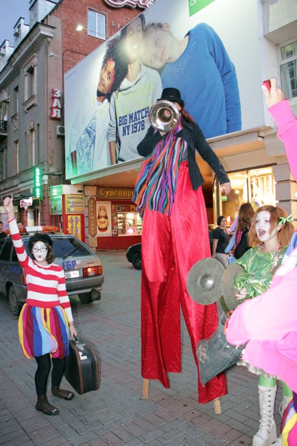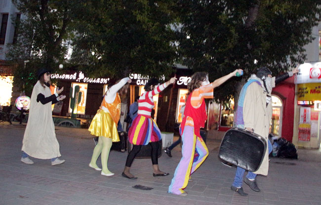 У здания консерватории они исполнили несколько акробатических номеров и водили хоровод, чтобы привлечь внимание к своей акции как можно большего количества человек.