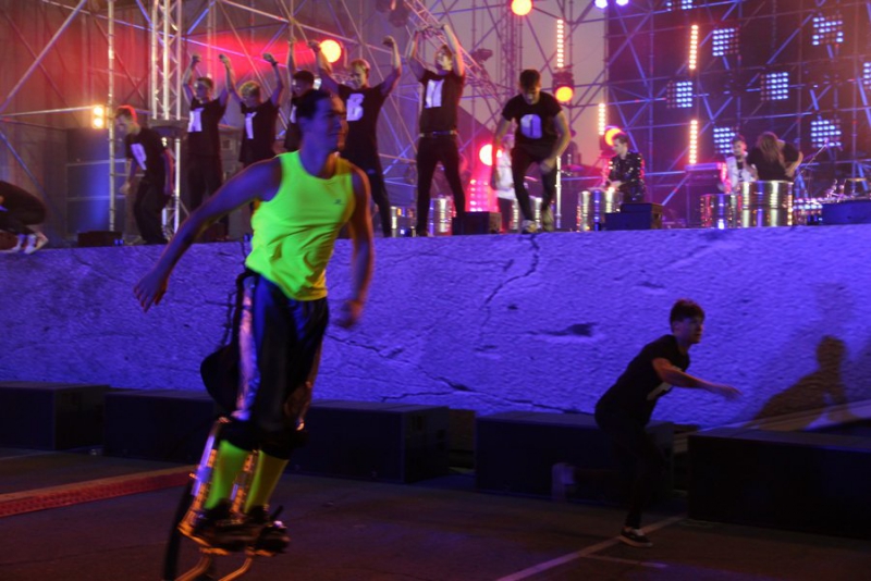 Будущим студентам показали экстремальное шоу, в котором по сцене ездили на большой скорости мотоциклисты и велосипедисты.